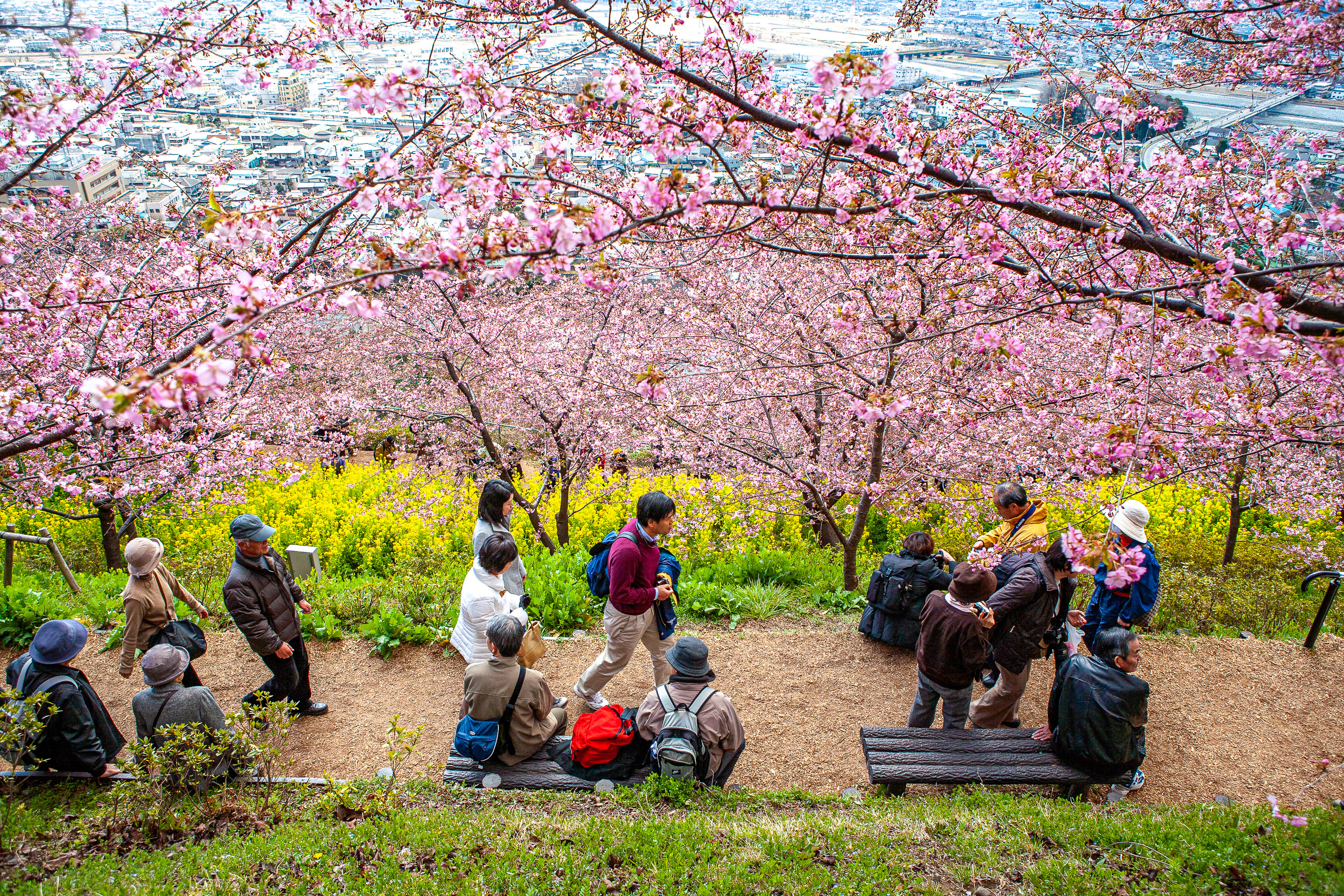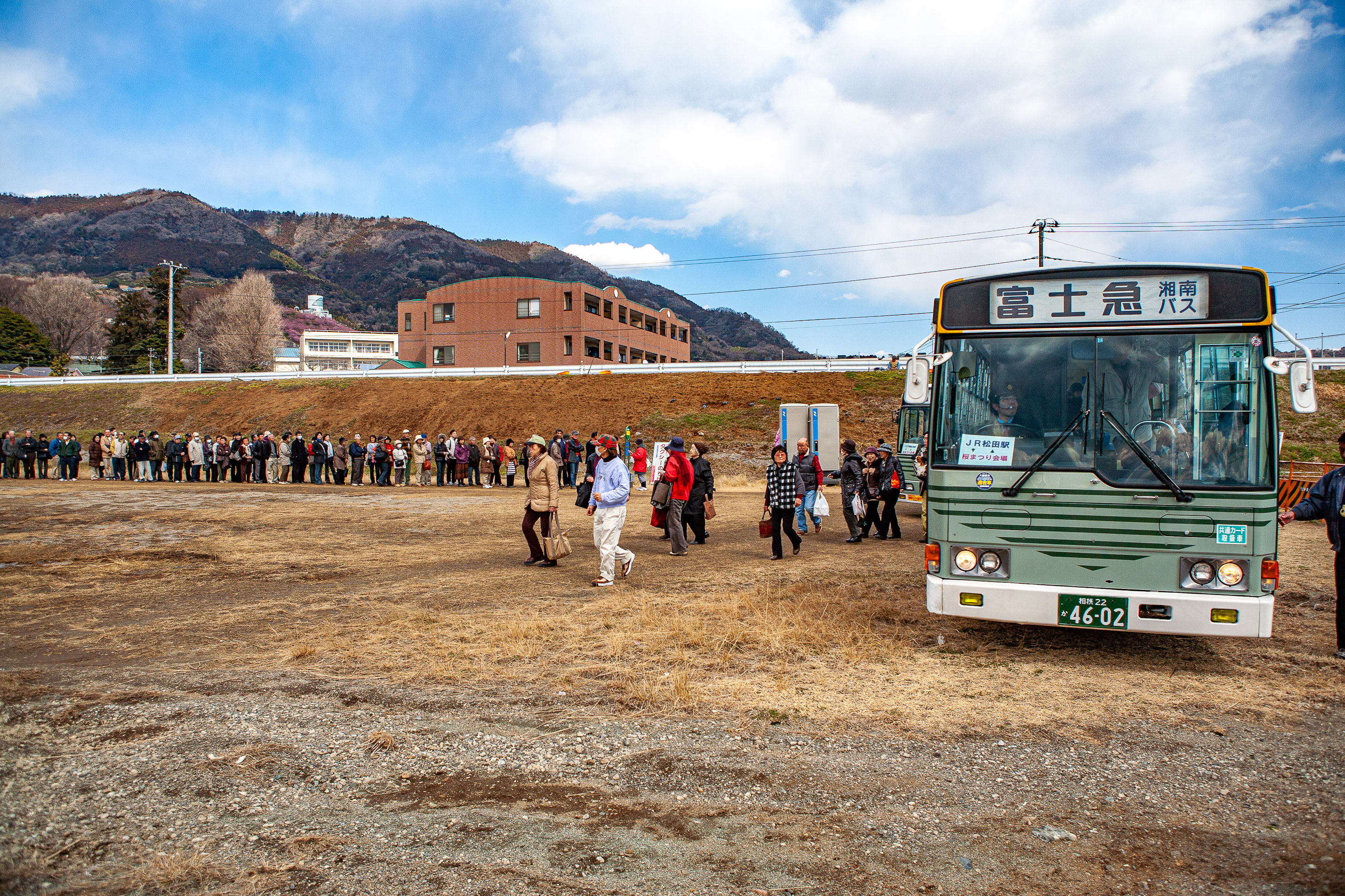 | 先月訪れた神奈川県松田町の「松田山ハーブガーデン」の河津桜を再び見に行ってきました。今日あたりがよく晴れて満開状態を見られる絶好の日だと思いました。そう思ったのは私だけではなく、大勢の人たちでした。  河津桜が見られるハーブガーデンには駐車場があるのですが、私が着いた9時半ではすでにいっぱいで、臨時の駐車場が10分ほど離れた酒匂川の河川敷につくられていました。車はここに置いて、ここからは、少し離れたところにハーブガデンとのシャトルバス発着場がこれまた臨時にできており、すし詰め状態のバスに乗って行きました。