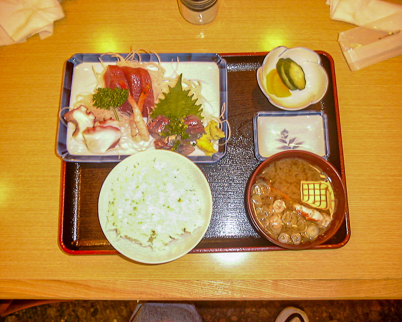 私が注文したのは、刺身盛合わせ定食でマグロ、アジのたたき、アマエビ、タコでした。写真の他に十種類以上もある小鉢に入った総菜を2個選べて、ご飯はおかわり自由で1200円。ネタはもちろん新鮮、特にアジがうまかったですよ。 |