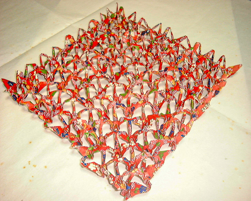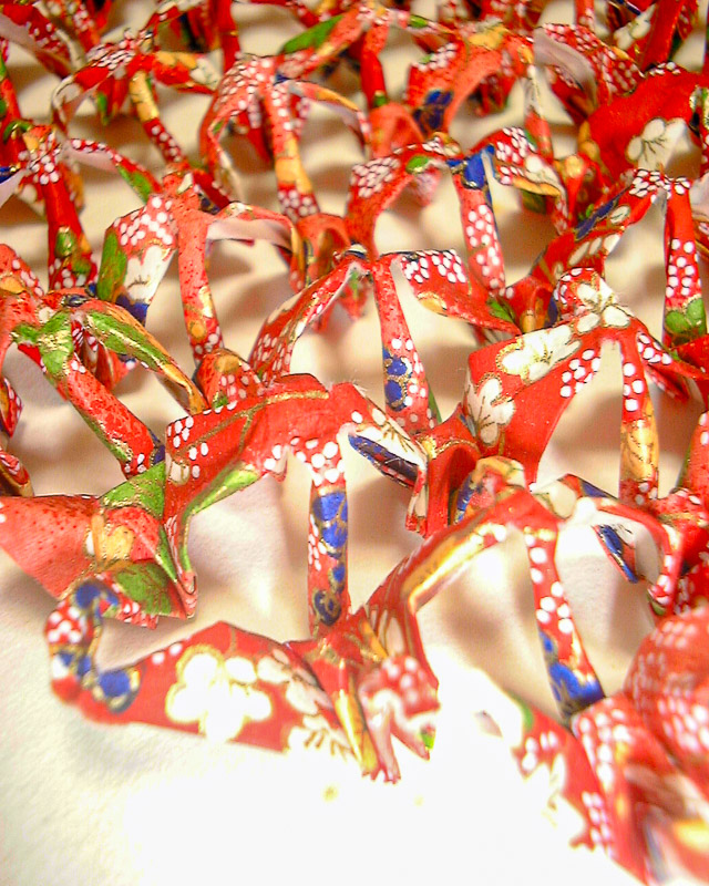 八田さんは、以前大和市に住んでいたときには、平和への願いを込めて、広島や沖縄まで徒歩で行ったような人でした。現在は、数年前から奥様の故郷である茨城県東茨城郡桂村に住み、地域の人々と交流を深めているようです。そして、この連鶴も自分が折り紙の講師になって子どもや他のお年寄りに教えているものです。一羽の鶴から三羽、九羽と腕を磨き、ついには百羽の鶴を一枚の紙で折ることが出来るようになり、地元ではちょっとした有名人のようです。