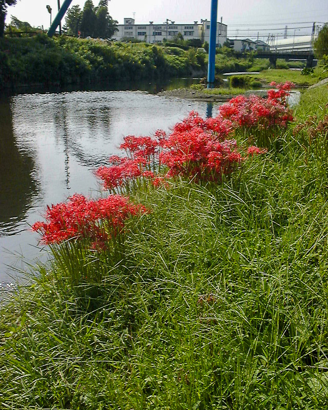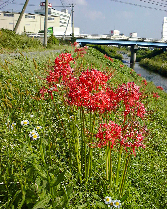 昼食後に先日も紹介した柏木牧場に買い物に行ったのですが、帰り道、遠くに赤い花が川の土手に咲いているのが見えました。彼岸花(曼珠沙華)です。伊勢原市で高速道路に近いところにまだこんな風景が見られるとは思いませんでした。