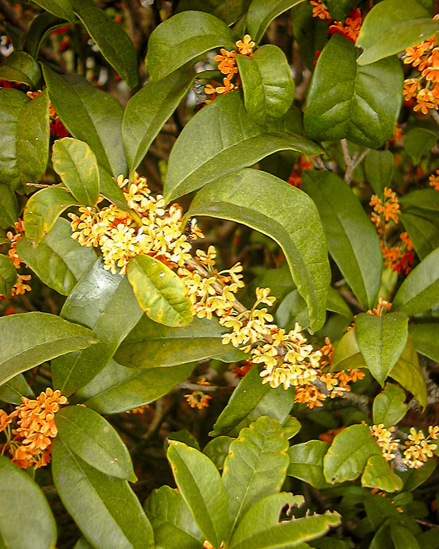 でも、秋を感じさせるモノがあります。住宅街を歩いていると甘いうっとりするような香りがそこここで漂ってきます。匂いはすれど姿は見えず、まるであなたは、○のような(+。+)・・・今日行ったとある大学病院の庭木の中にその香りの主である金木犀を見つけました。
