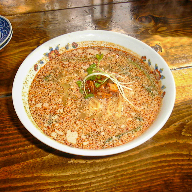 私は、ここの四川担担麺が好きで、来ればこれと餃子を注文します。担担麺は、四川風の辛味ゴマみそ風味ということで、表面がラー油でしょうか、真っ赤になっています。(写真ではさほどわかりません。)一口スープを口にすると、摺ったゴマのまろやかさが伝わって甘い感じですが、しだいに辛さが脳天に達していきます。辛いものは苦手なのに、わざわざ汗びっしょりになって、麺とともに、スープを最後まで飲んでしまいました。(^^;;; |