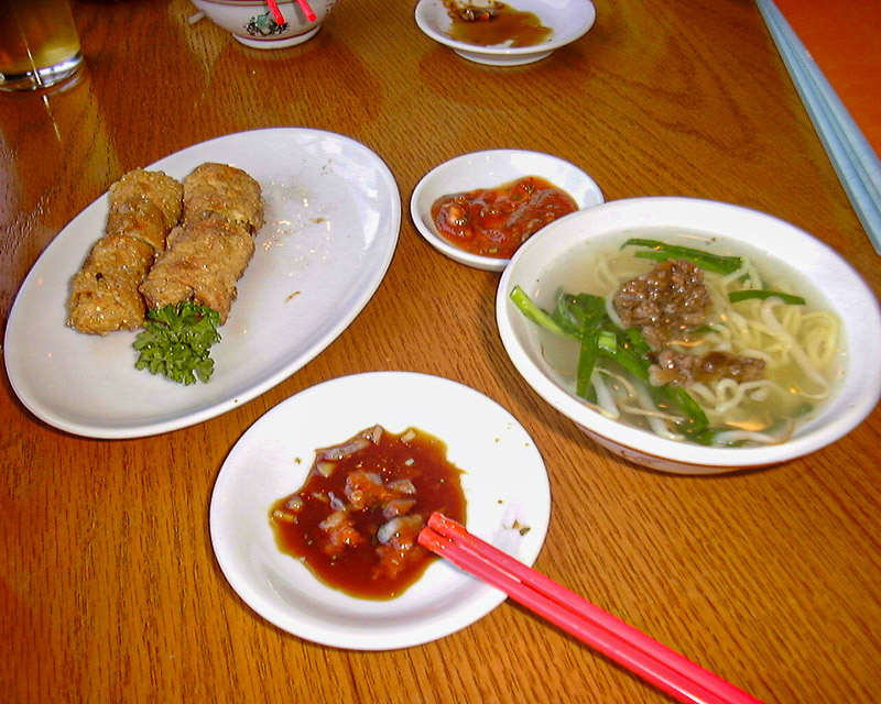 昼食でもなく夕食でもない軽い感覚で食べるのにちょうどいいと思います。注文したのは担仔麺(ターミン)と香酢蝦巻(エビ巻)。ターミンは、小どんぶりに入ったスープに麺、ニラ、もやしに独特のミソがのっています。ほんとに少ししか入っていないので物足りず、もう1杯追加しました。このスープの香りは、タイ・カンボジアっぽいものを感じました。1杯150円。エビ巻は、エビにタマネギと百合根らしきものが入ったものを巻いて揚げたもの。それを、チリソース風のジャンにつけて食べます。その百合根らしきものの歯ごたえが心地良かった。