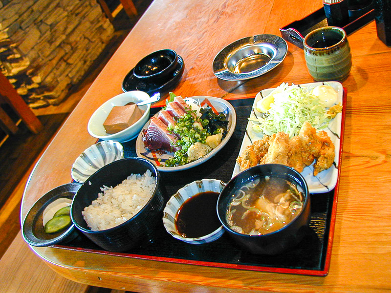 日替わり定食、左が「カツオ刺・カキフライ定」、右が「真イワシ刺丼・白キス天定」。みそ汁の具がヒラメのアラらしきもので、深いコクがあって、しょっぱさがなく、絶品でした。