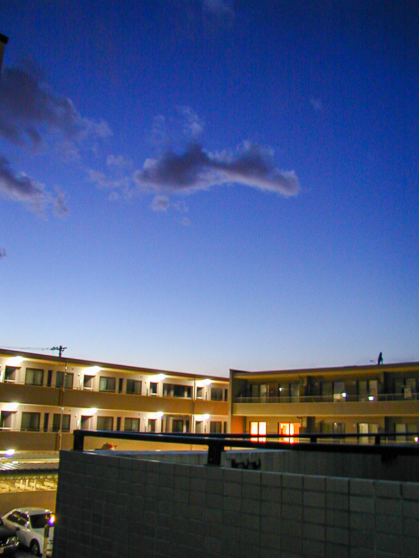 帰り際、我が家の玄関口から見た夕暮れです。新しくできた隣のマンションの廊下の明かりが建物の形を浮き上がらせていました。