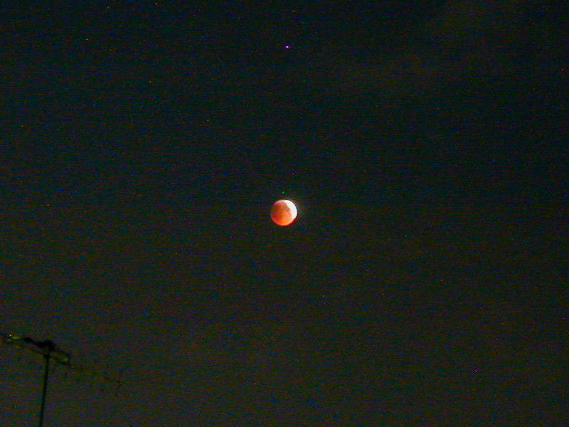 今晩の皆既月食は、一生に一度のものとか・・・・10時02分の皆既月食状態は、ピントが合わず直前の映像(9時55分ごろ)です。