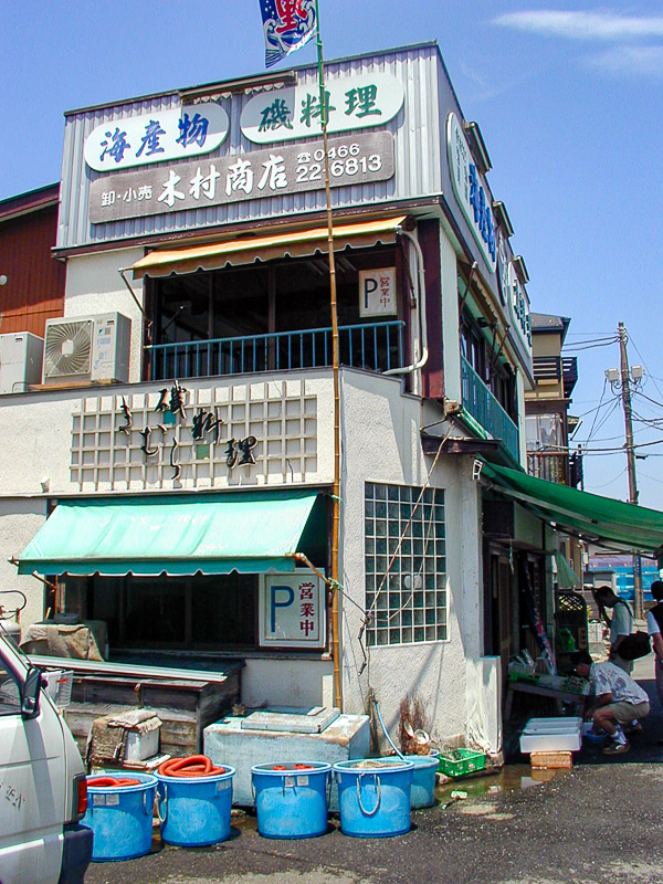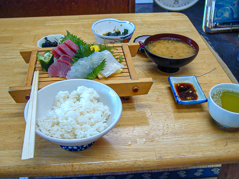 | 江ノ島の猫を撮りに来たときは、ここで昼飯をいただきます。今日は、さしみ定食、消費税込みで2100円、確かに安くはないけどおいしいのは、天下一品。このお店の人が近くの公園の野良猫たちのエサや簡易ねぐらを用意してくれているのです。 |