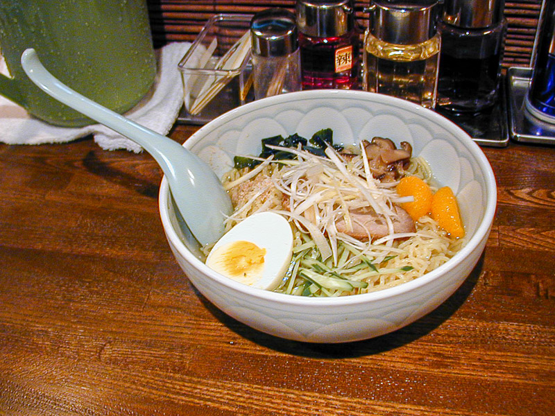 冷やしラーメンは、豚、鶏がらの塩味スープで同じ麺で、チャーシュー、味玉子半分、キュウリ、シラガネギ、味付けワカメにシイタケと缶詰ミカンがふた房というところ。これも非常にあっさりしており、摺ったシロゴマを少しふりかけている。