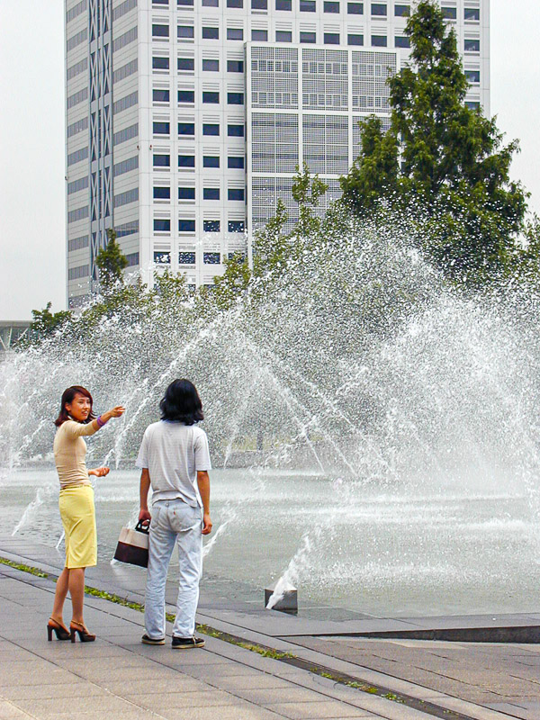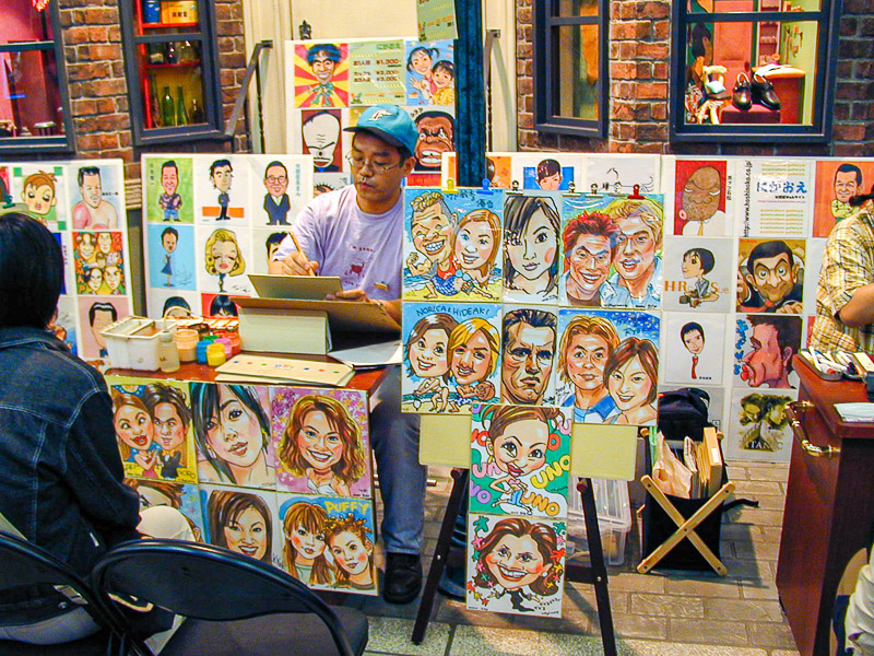 美術館の外に出て、噴水を見ながら、ワールドポーターズに行きました。ここの映画館の近くで似顔絵描きをしている人たちがいて、先日の上野と違い、ポップな若者受けしそうな絵で客が列を作っている店もありました。