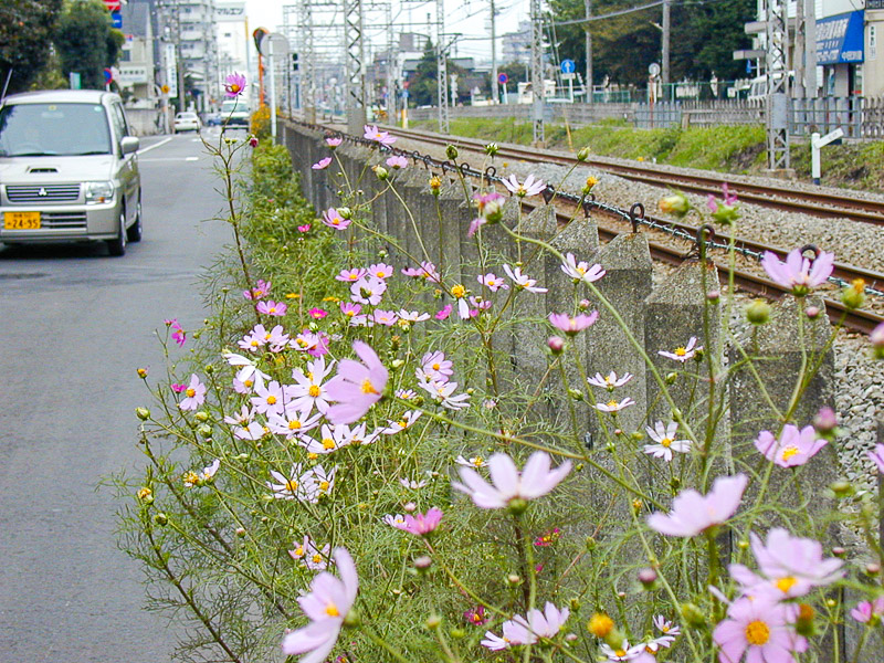 まだ、コスモスが咲いていました。小田急江ノ島線の線路脇の道を車で大和駅から鶴間駅方面に向かっているときでした。線路と道との間の柵に沿ってところどころ植えられているのでした。曇り空の殺風景な場面でこんな可憐なコスモスに出会うと、この花の世話をしている人の心のやさしさを感じますね。