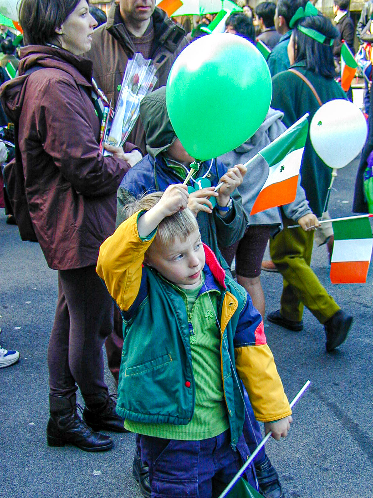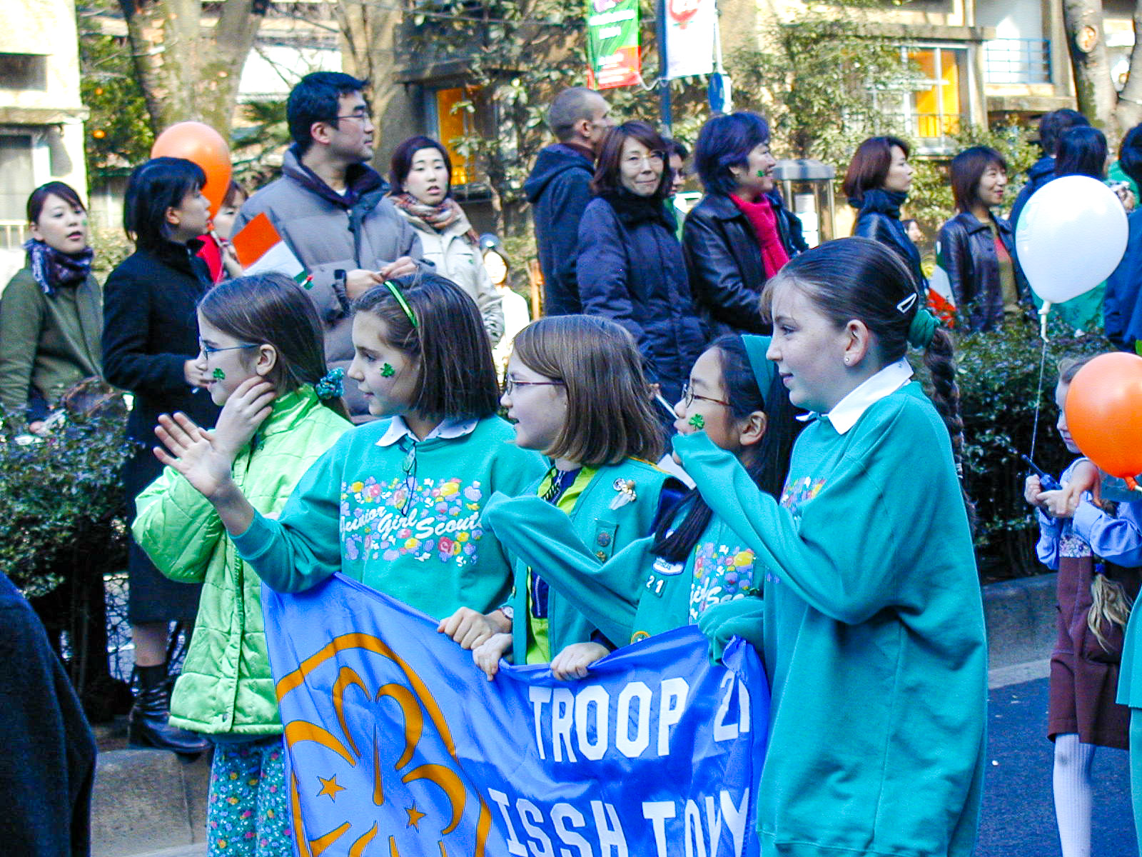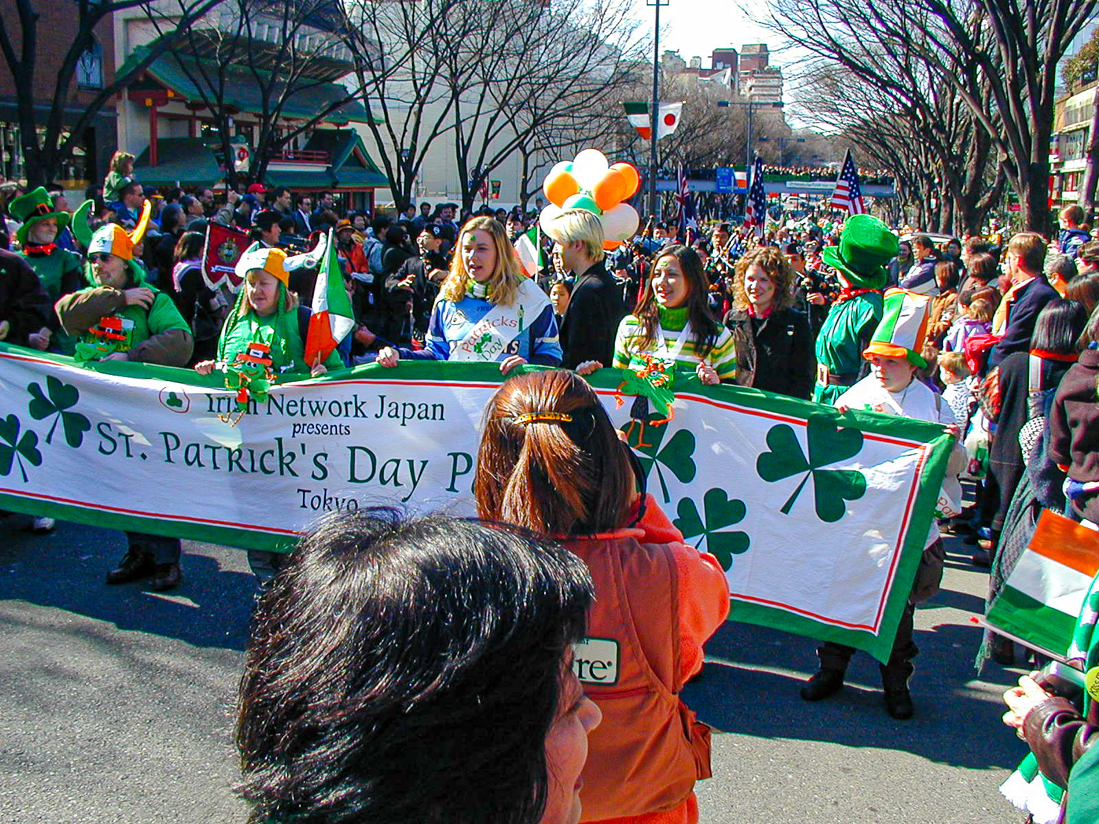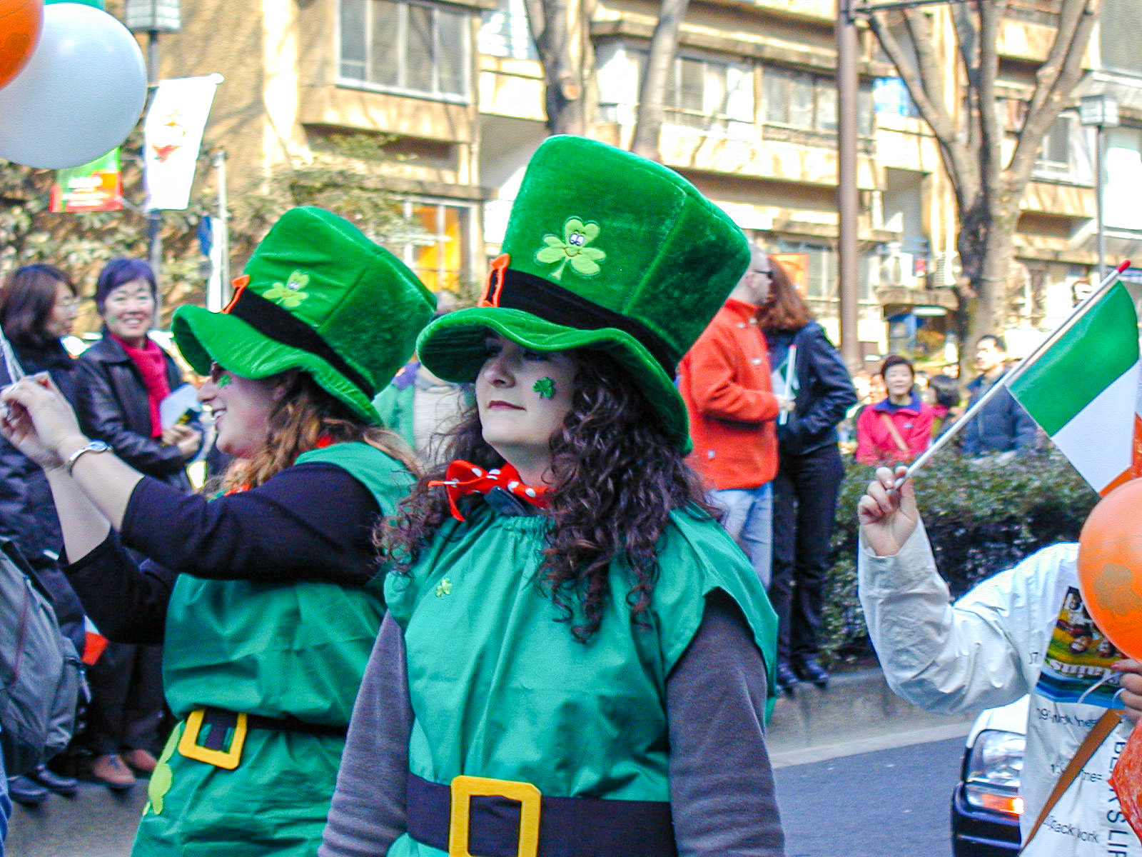 昼食後、フロム・ファースト通りから表参道に入ってぶらぶらしていると、にぎやかな通りがさらになにやら盛り上がっていました。今日は、聖パトリック・デイのパレードだというのです。アイルランド系移民たちがその祖先でキリスト教の布教活動で知られる聖人パトリックの命日にちなんで行うお祭りだったのです。アイルランドでこの季節にあふれる三つ葉のクローバーをシンボルマークとして、緑色のものを身に付けることが約束事になっています。北米では盛んに行われているようですが、日本では珍しいようですね。もちろん、私もはじめて見て、びっくり。東京中のアイリッシュがみんな集まったような日でした |