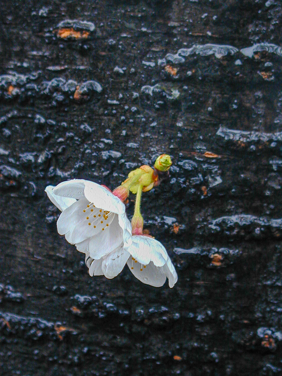 昼過ぎに大和市福田にある千本桜に行って来ました。雨は降り続いていました。雨に打たれる桜の花が悲しげです。ある桜の木の幹に直接、花を咲かせているのを見つけました。けなげだなぁ、って感じますね。ここでは、デジカメのみの撮影でした。
