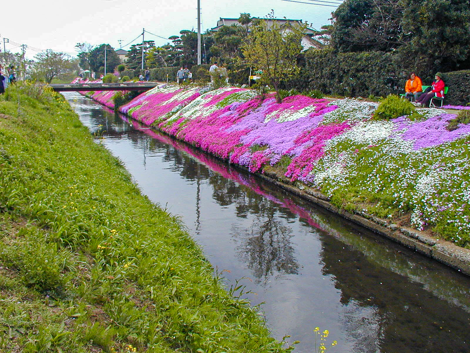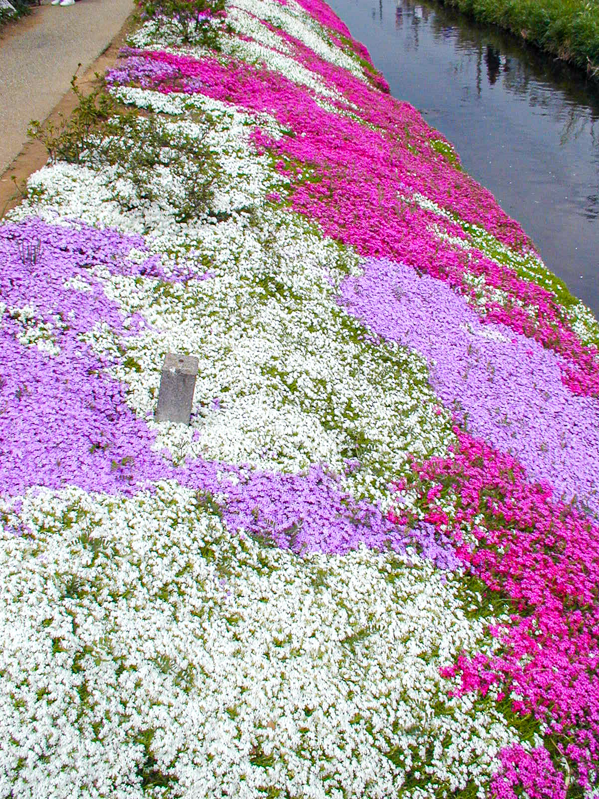 神奈川県伊勢原市上谷に渋田川という川があります。農家の用水路でしょうか、整備はされていますが土の堤が残っていて、今、色とりどりの芝桜が咲き誇っています。片側の土手だけですが、1キロメートル近くはあるでしょうか。延々と芝桜の帯が続いています。川沿いの農家の人たちが植えているようです。