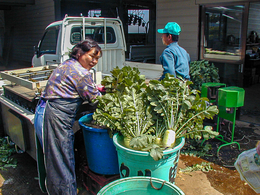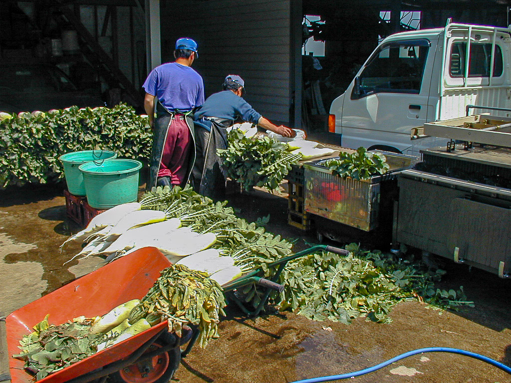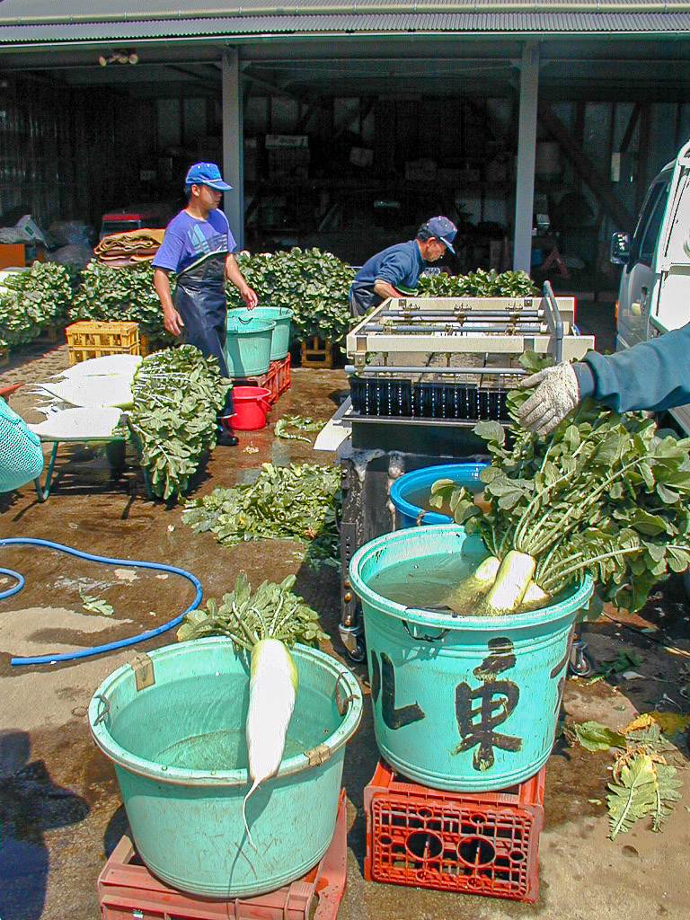大根のヒゲを取る機械に、泥を落として真っ白に仕上げる機械があって、大忙しでの作業の様子。この後また畑に取りに行くとのことでした。