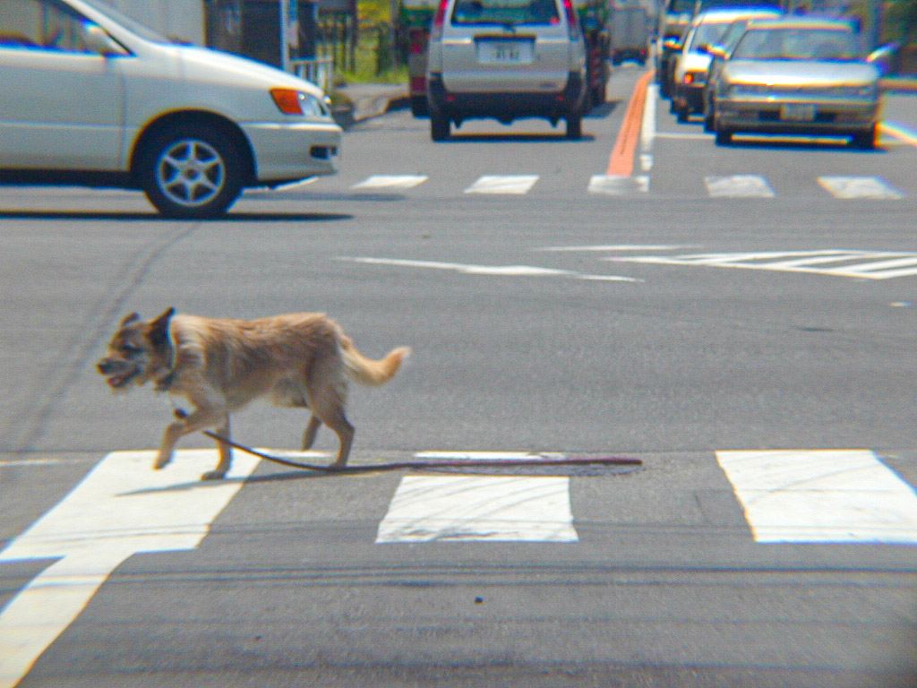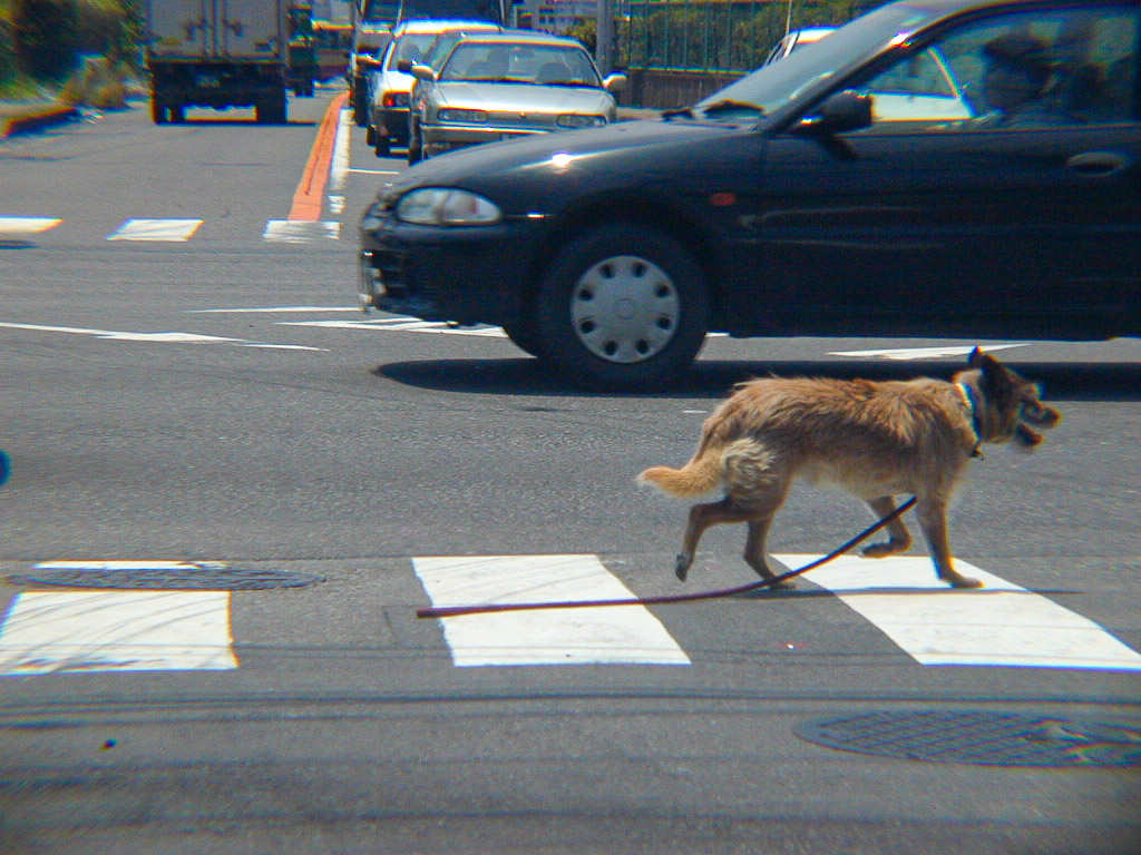 思考を停止させてしまうような今日の暑さの中、私は信号待ちをしながらこの犬のドラマをめぐらせていた。と、次の瞬間、犬を避けようとして急ブレーキを踏んだ車に後続車が追突してしまった。犬は、一瞬驚き、再びもと来た道を何食わぬ顔して引き返していくのであった。