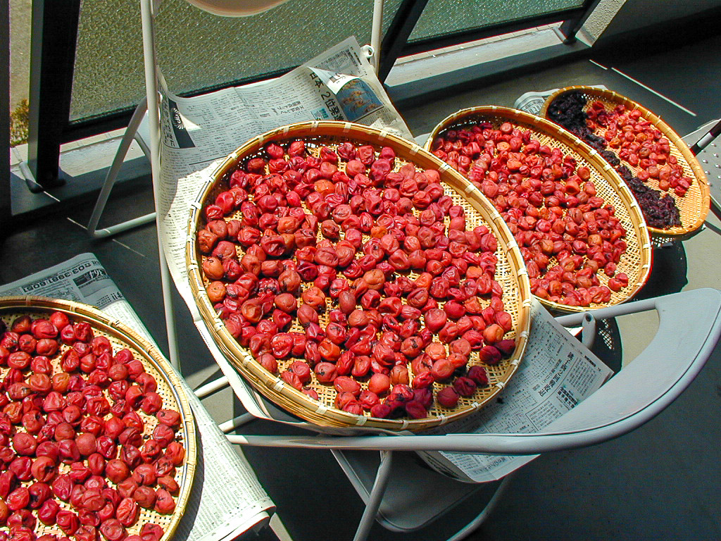 三連休の初日、待ちに待った(?)梅干しを行いました。三日三晩干し続ける原則があるので、この連休を逃すと難しいのです。実際は、シソによってもっと赤く染まって見えます。ほんのり塩が浮くぐらいになればいいでしょう。