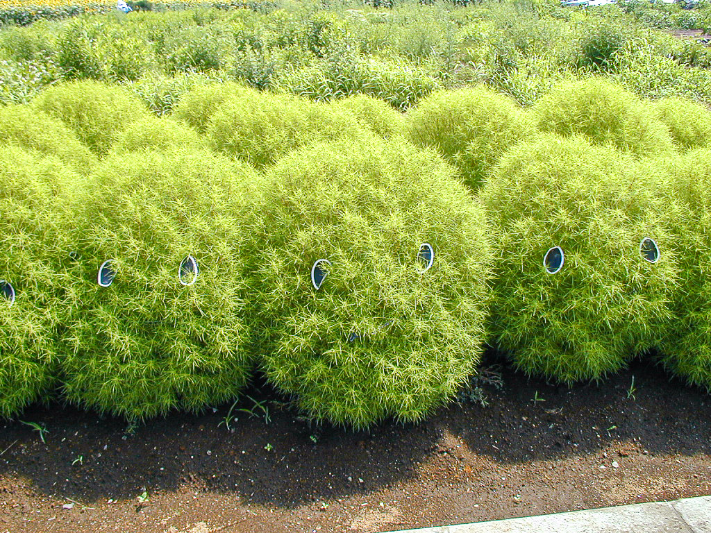 このひまわり畑の近くに、ほうき草があったのですが、誰かがイタズラして、目を貼り付けてありました。ユーモラスで宮崎駿の世界のようですが、生きている植物を傷つけるようなマネは、やはり、慎みたいです。