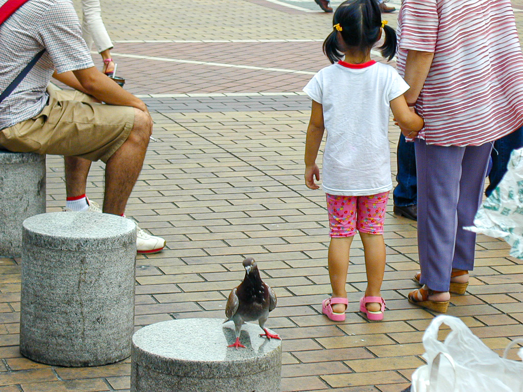 人の集まる街なかに住みついてしまったハトたち・・・彼らは、人が落としていく食べ物、あるいは、与えるエサを目当てにポイントとなる場所にたむろしている。動作は機敏で人が食べ物らしき袋を手にしているのをしっかり観察しており、羽ばたいて近づいてくる。ほんとにエサをくれるのかどうかを見極めようとする。その姿、目付きは、決して人間たちと友好関係を結ぶ態度ではなく、常に警戒心をもって、エサを得る、という目的にのみに神経が注がれている。
