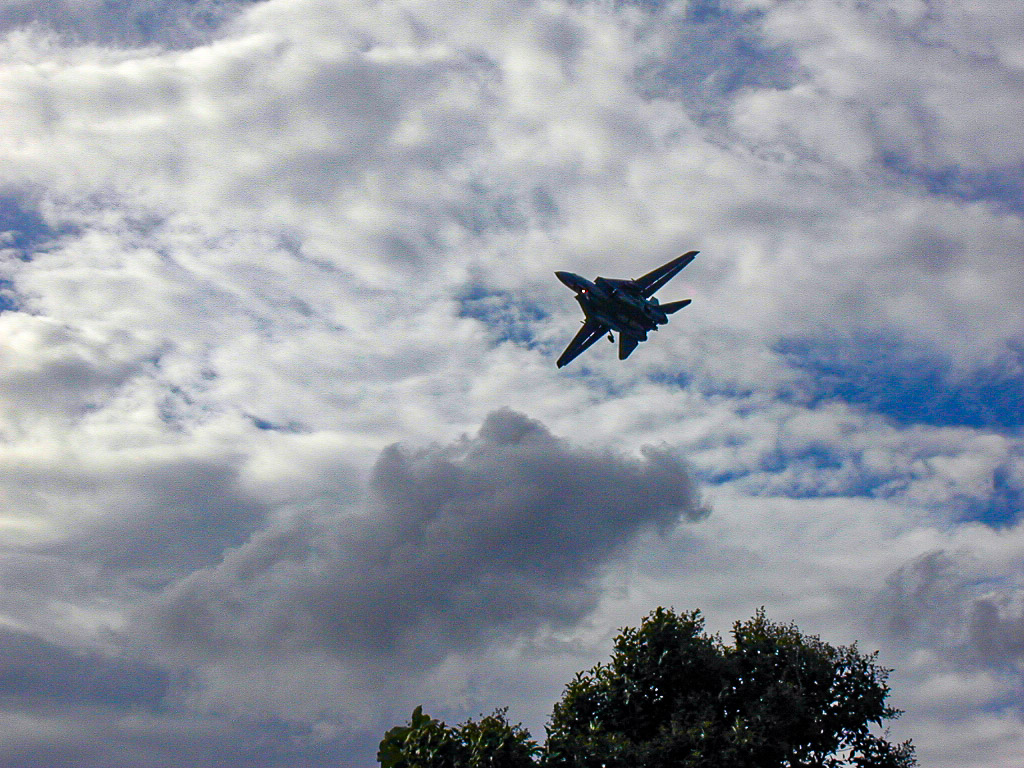 私は神奈川県大和市に在住している。アメリカ軍と自衛隊が駐屯する厚木基地のある街である。この基地は、太平洋戦争終結直後マッカーサーが降り立ったところとして知られ、現在は、横須賀基地とともに米第七艦隊の後方支援基地として軍事的に重要なものとされている。滑走路を航空母艦と見立てての夜間訓練「NLP」が基地周辺の住民に墜落の恐怖と騒音を撒き散らしている。今日は、土曜日で普通なら訓練のない日のはずが、朝からジェット戦闘機(写真はF-14と思われる)やレーダー機、ヘリコプターが離発着訓練を繰り返している。基地騒音に慣れた私たち市民にとっても異様な光景である。まさに、戦争に突入していくのを肌で感じ取れるところに私たちは暮らしている。