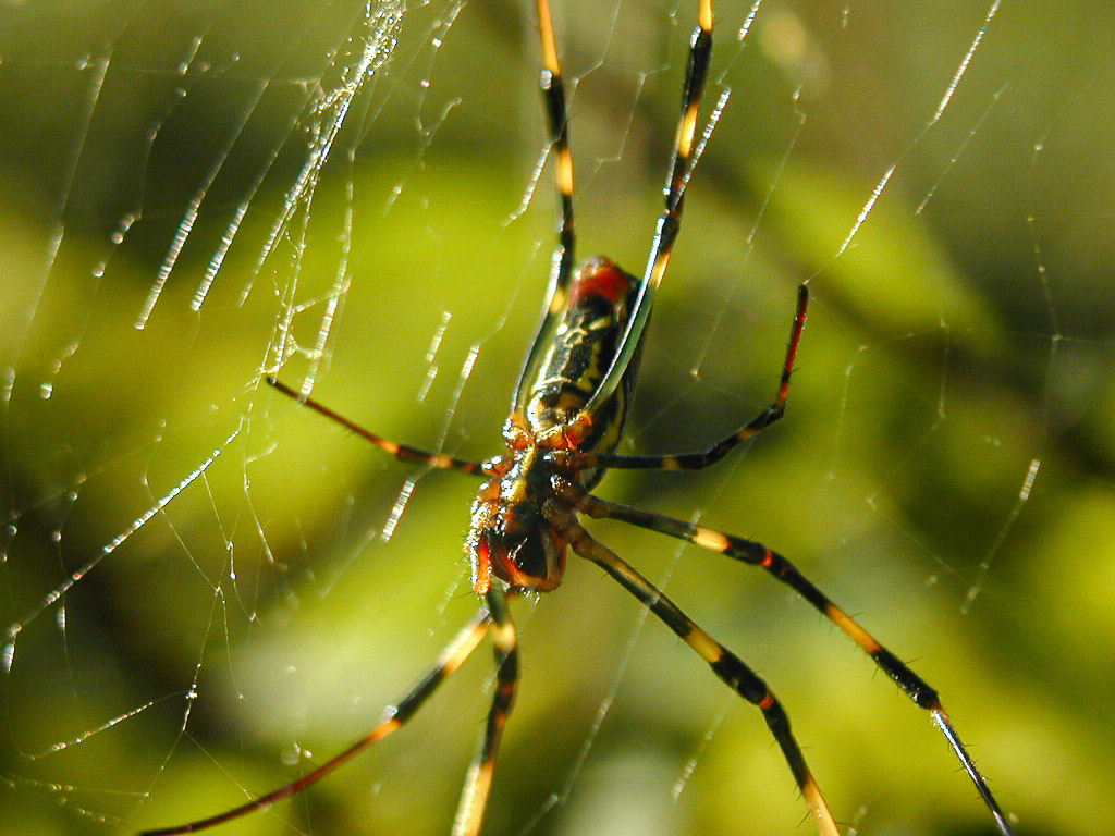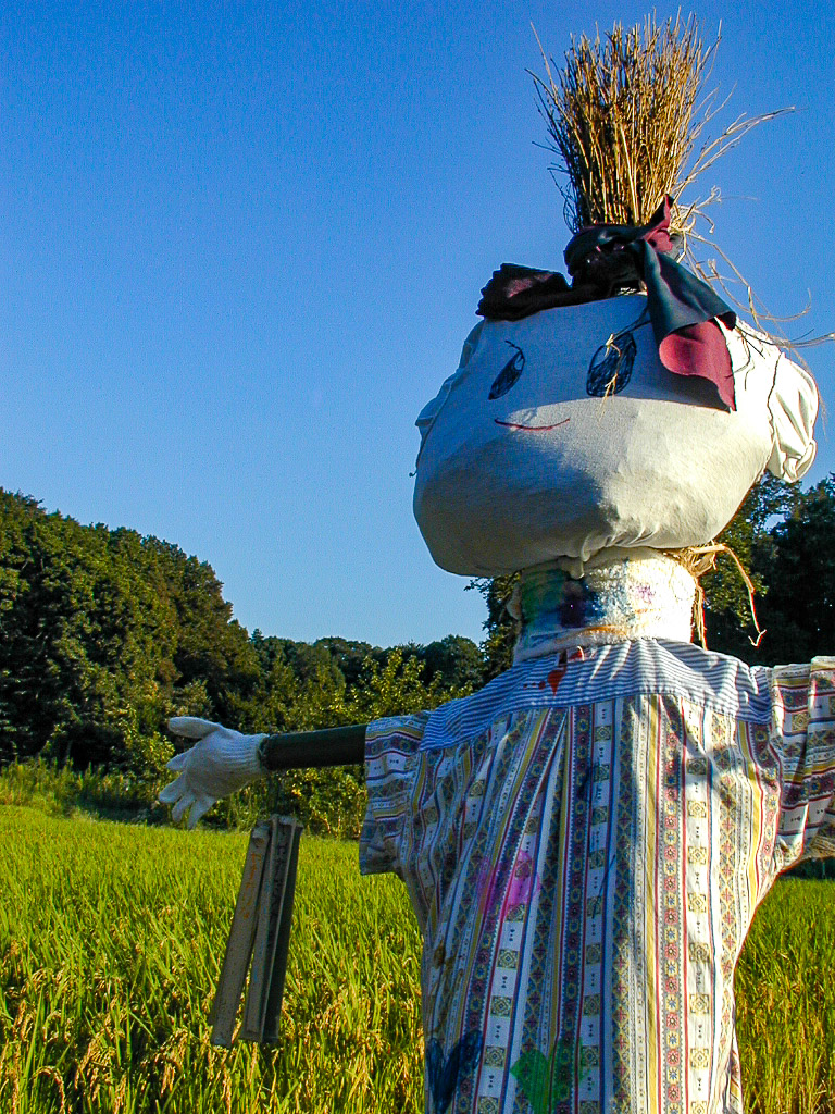 赤とんぼがじっととまったまま動かない。蜘蛛も西陽を浴びて、おのれの存在を主張せず、獲物を待つばかり・・・やがて、輝き出すであろうススキの若い穂も陽を受けていました。そして、収穫を間近に控える谷戸山の小さな田んぼには、愛嬌のある案山子が作ってあって、散歩で通りかかる人の目を和ませていました。