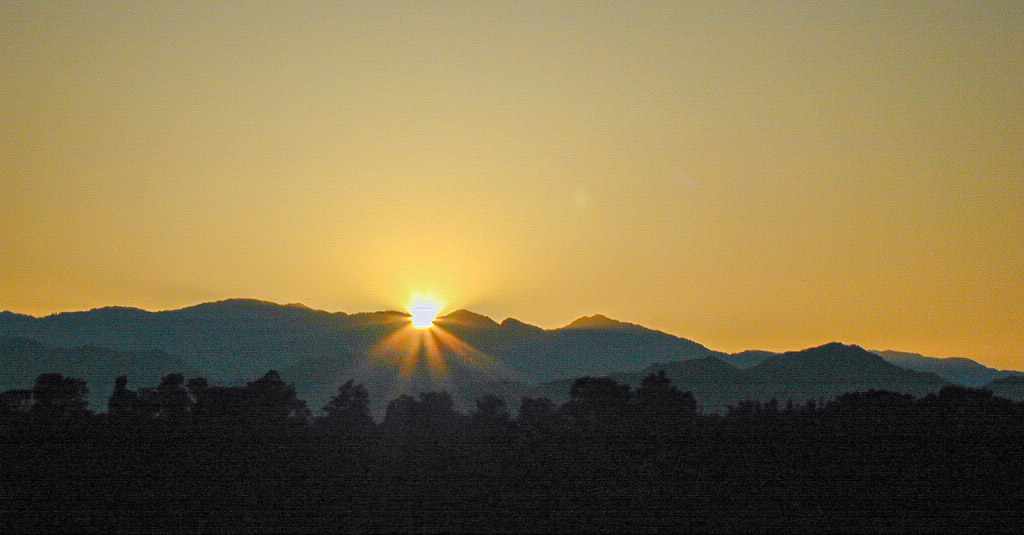 朝陽が荘厳で厳粛なものを抱かせるとすれば、夕陽は雄大な力強さを感じさせてくれますね。丹沢の山々に静かに沈んでいく太陽は、雲を寄せつけず、その堂々たる様を見せていたのでした。 |