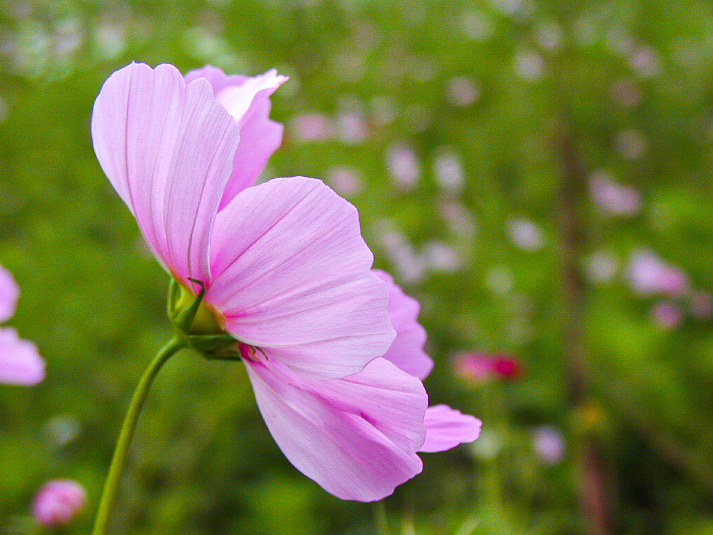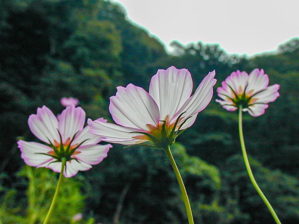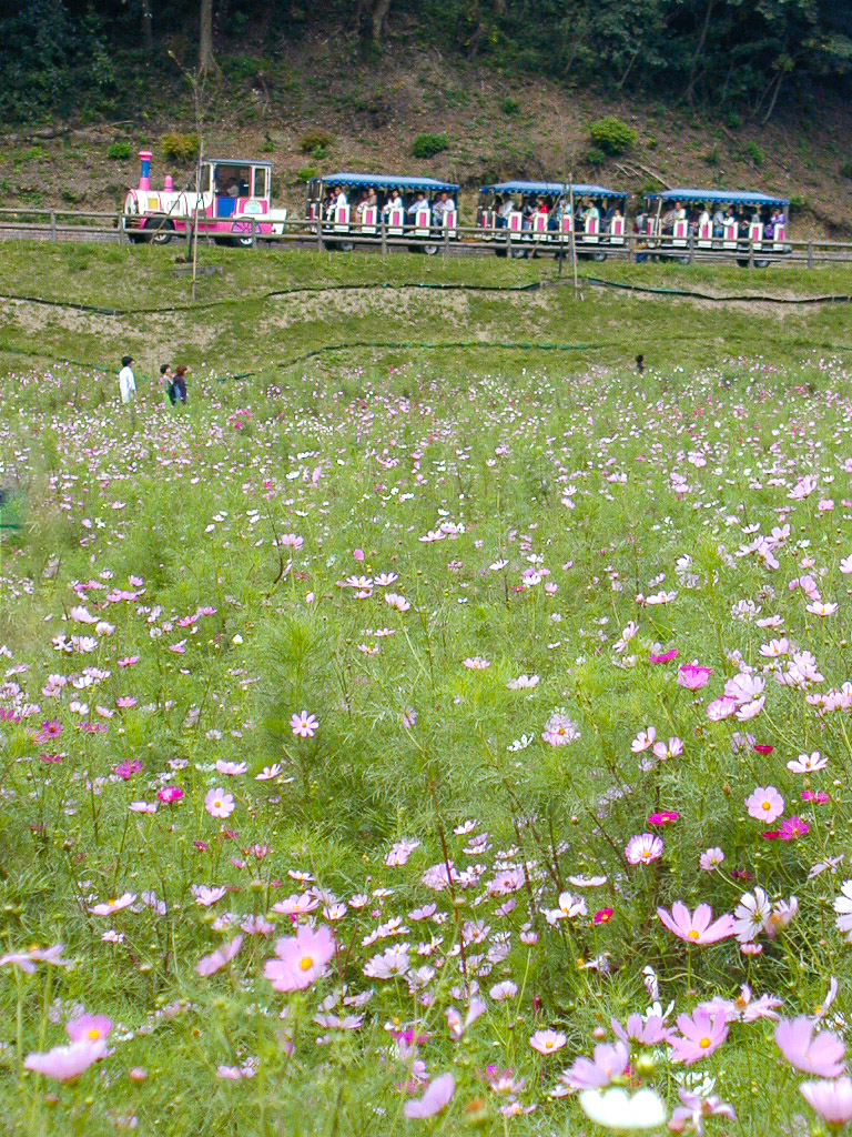 9月前半の台風のせいでしょうか、倒れてから伸び上がってきたものが多く、痛ましい感じでした。それでもけな気にさまざまな種類のコスモスの花を咲かせており、多くの観光客の目を楽しませていました。