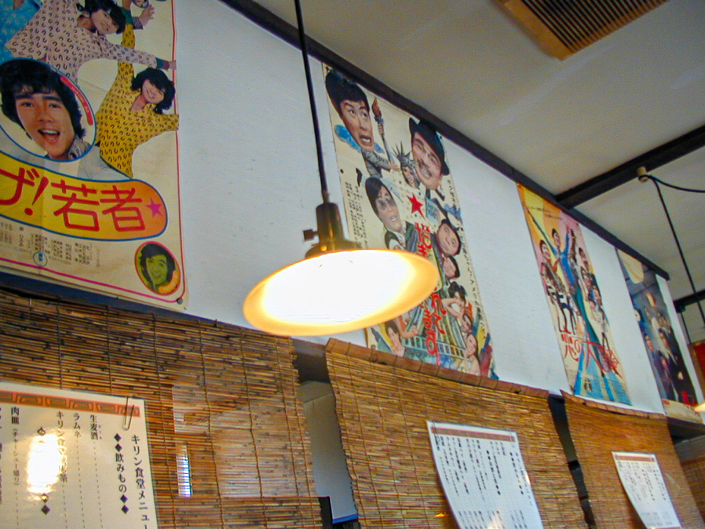 先日、ここに来ようとして迷子になり、別のラーメン店に入ってしまったのでしたが、今日、再挑戦して見つかりました。何ともレトロな雰囲気の店で、長屋風の建物の中は、昔の映画ポスターが飾ってあったり、白熱電球や水のおかわりはアルマイトのやかんでという調子です。