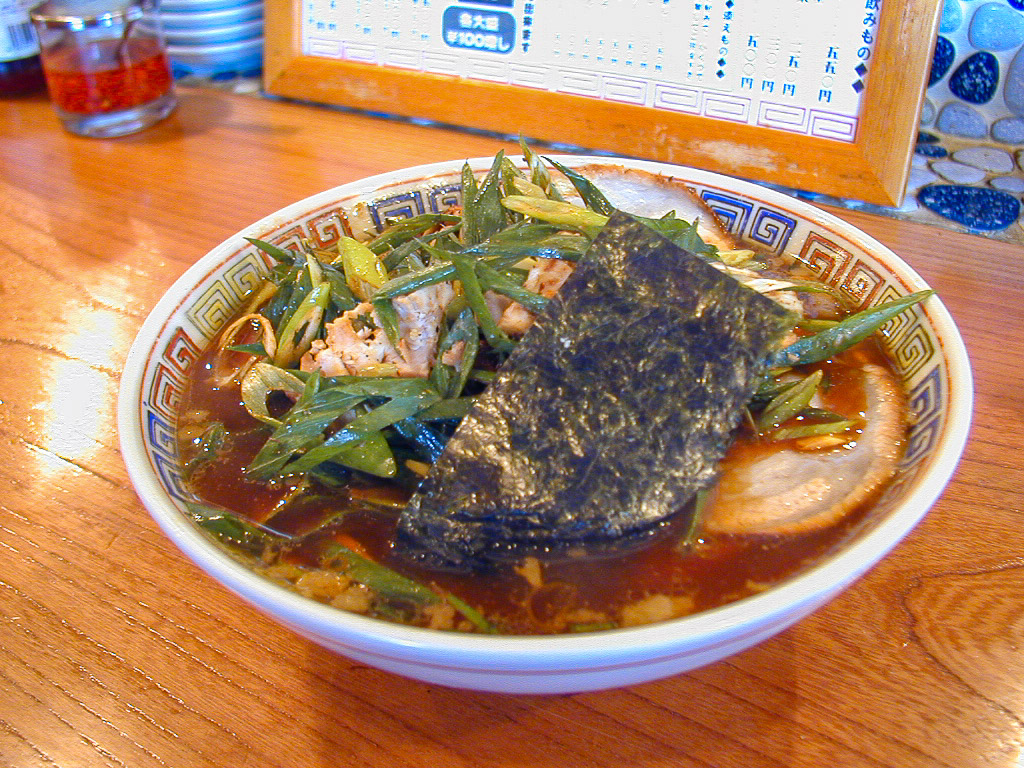 注文したのは、肉青葱ソバ(ニクネギソバ)のしょう油でした。これまたレトロなナルトマークの中華ドンブリに色の濃いしょう油ラーメンで、炒めたアオネギと柔らかい舌触りの大きなチャーシューと刻みチャーシューがぎっしり。スープは、かつおダシの効いた濃厚なしょう油味、好みの分かれるところか?麺は、細いストレートなもので、淡白。ナルトとノリが申し訳程度についているが、昔ながらを意識したもののようだ。