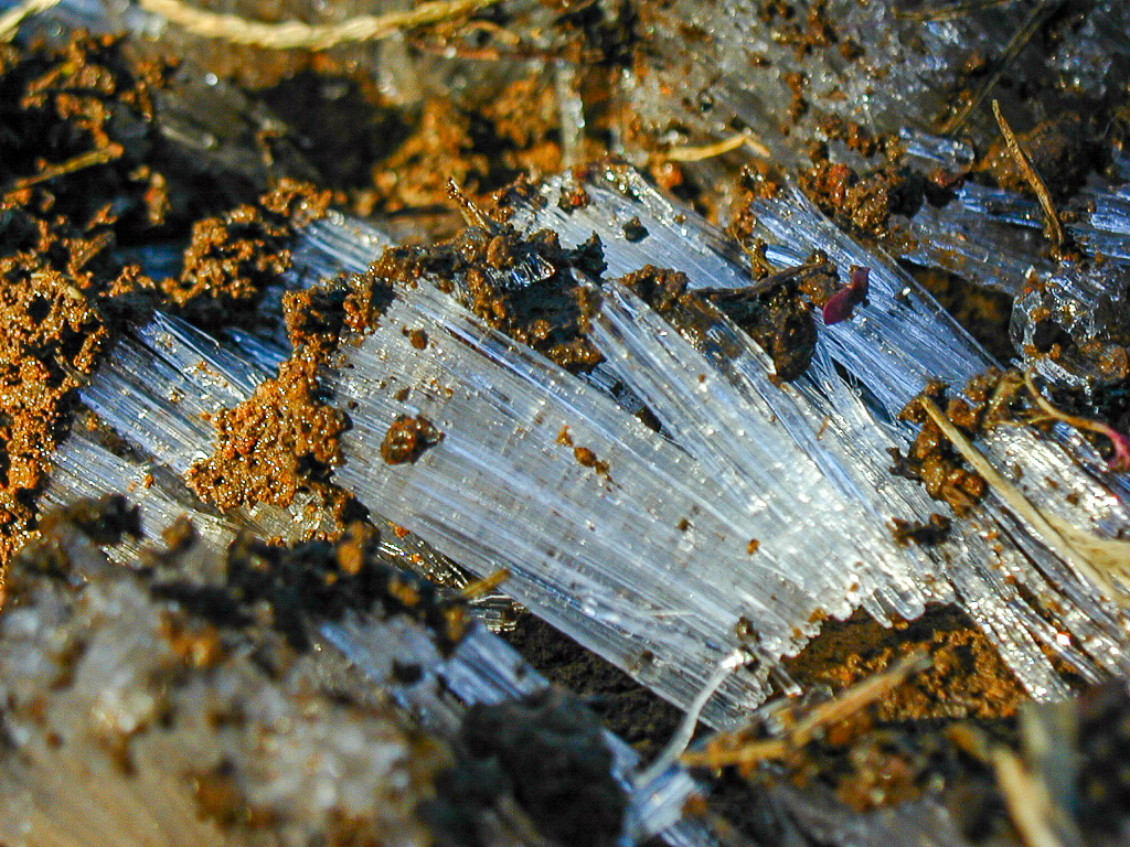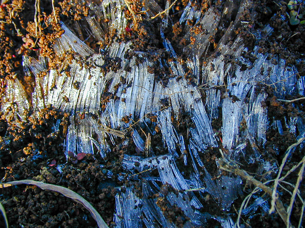 そして、畑の陽のあたらない場所には、何と霜柱があったのです。これだけきれいに成長した霜柱を見るのは、久しぶりのことで、感動しました。相模原浄水場の近くです。私が子どもの頃は、こんな風景とともに冬の始まりを感じるのでした。 |