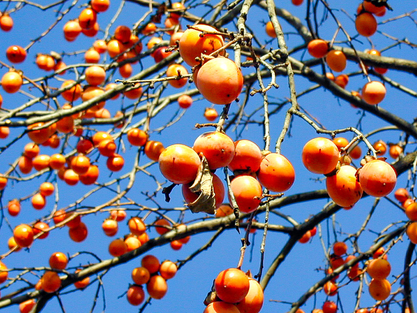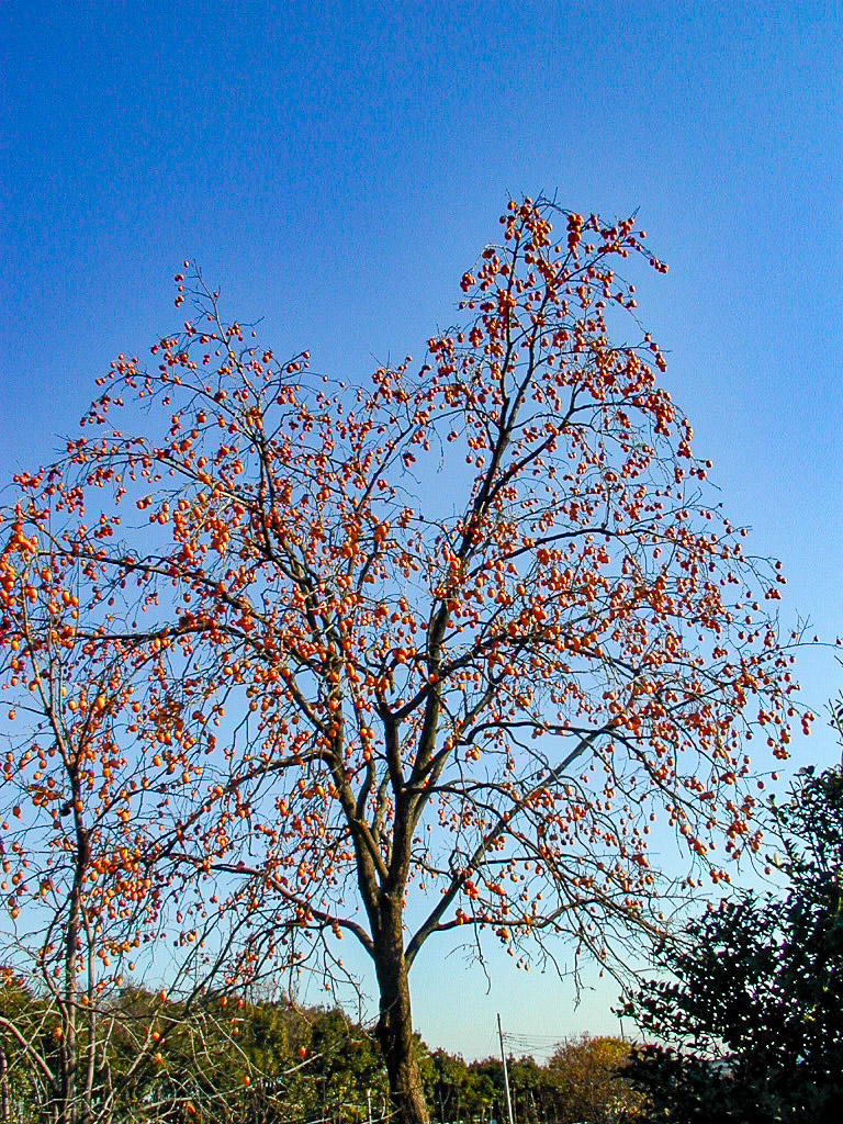 ラーメンを食べての帰り道、道沿いに大きな柿の木で赤い実をたくさんつけているのが目にとまりました。近くに車を止めて柿の木のある広い畑の中を入って行ってみました。おそらく渋柿なのでしょう。実の大部分は採られることもなく、熟した実からムクドリがついばむ姿が見られました。