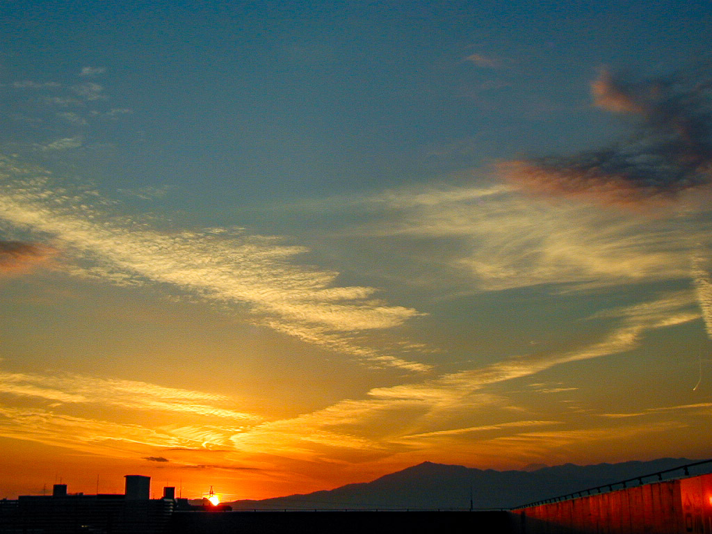 夕暮れ時に買い物の運転手として近くのスーパーに行きました。各階の駐車場が満車でとうとう屋上まで行くことになってしまい、やれやれと思っていたら、西の空がきれいに染まっているのが目に飛び込んできました。丹沢連峰もくっきりとシルエットを見せ、陽が建物と山の端の境界に沈んでいくところでした。