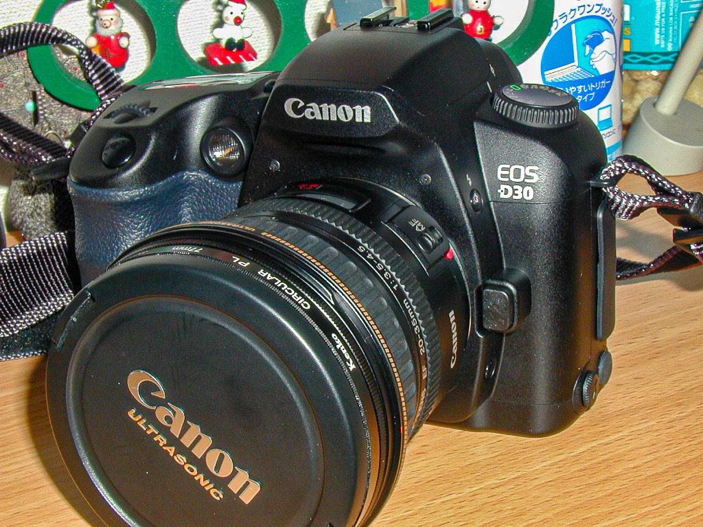 | ボーナスをはたいて、とうとう一眼レフデジカメのキャノンEOS D30を通販で買ってしまいました。世間では、EOS-1Dが出たところですが、そちらはまるで手が出ないので、1年間考えた末に購入したのです。まだ、テスト撮影の段階でなんとも言えませんが、一番の欠点である広角レンズが広角で使えないという、私のように24mmや20mmを多用する者にはやはり不便です。20mmが1.6倍した32mm相当でしか画角が取れないので、迫力ある広角画像になりません。また高感度に設定するとどうしても画面が粗くなってフィルムの粗さと異なり、平坦になります。年末年始の休みはこれで色々と撮影して、いいところを見つけたいと思います。高い買い物なので、元を取るまで使いますよ。(^-^; |