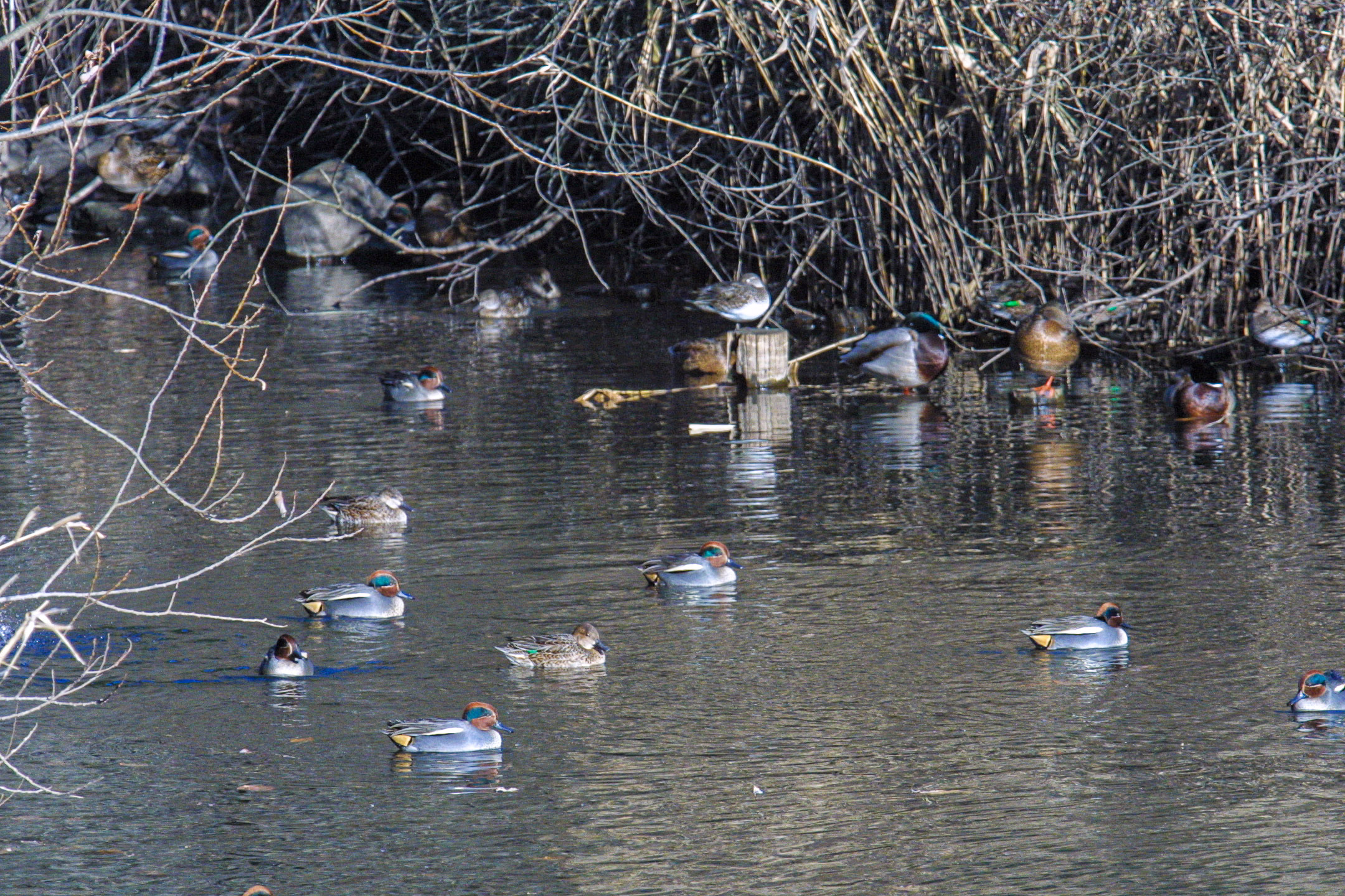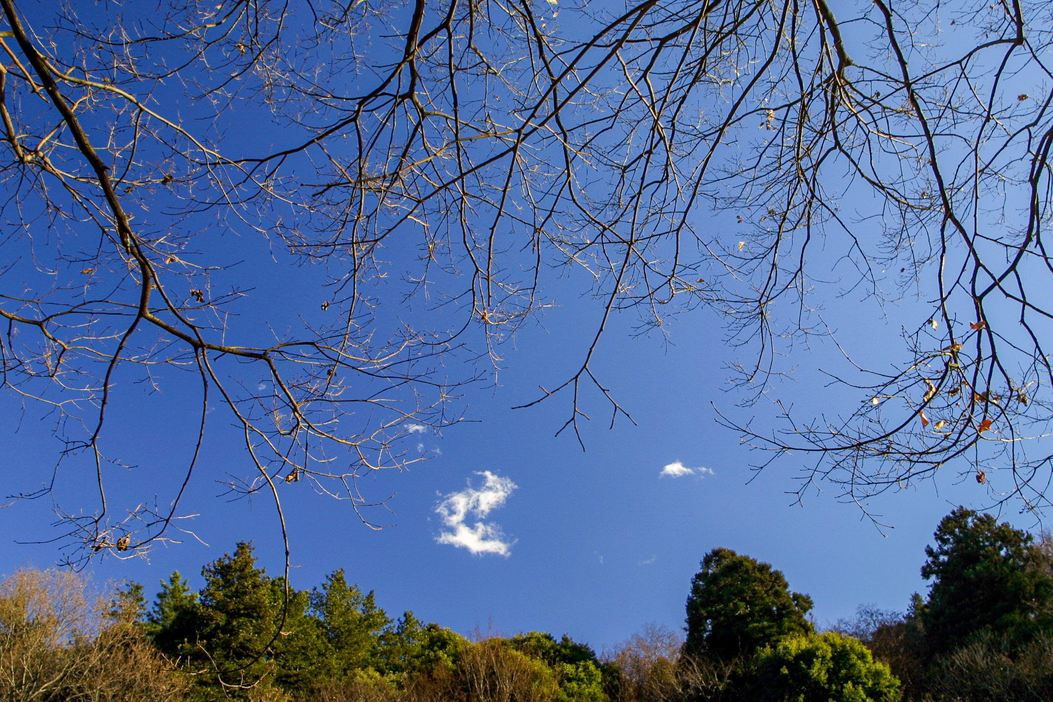 冬を迎えている谷戸山は、穏やかによく晴れていました。池には、無数のカモが陽を浴びてのんびりとしています。花も葉も枯れ落ちてしまいましたが、豊かさを感じることができる谷戸山です。