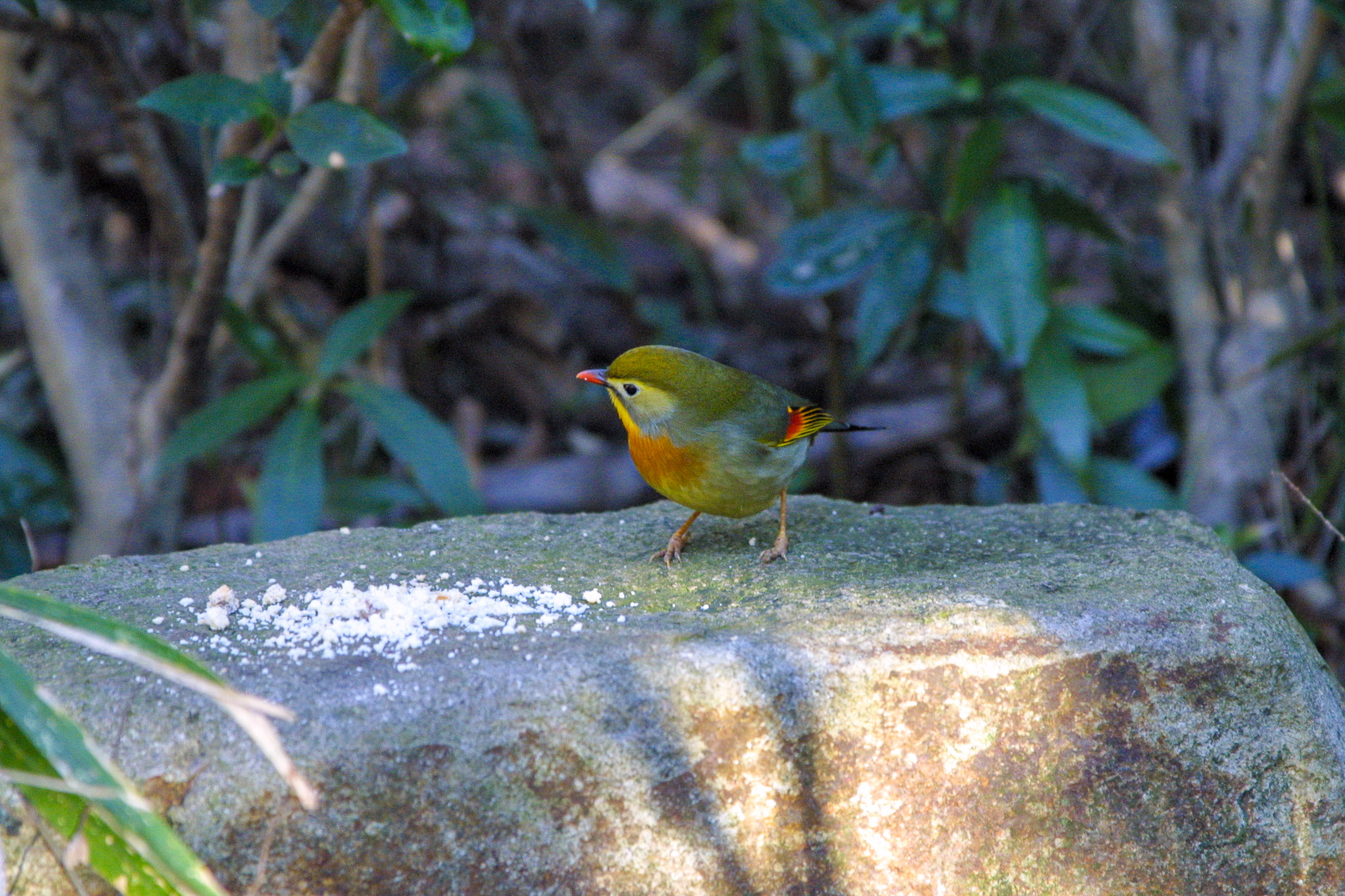 帰ろうとしていた山道で、白人の女性から手招きされ、「ソウシチョウですよ。」と声をかけられました。連れの日本人男性とパンくずをあげています。木々の間から十数羽の色鮮やかなこの鳥が飛び交っているのが見えました。