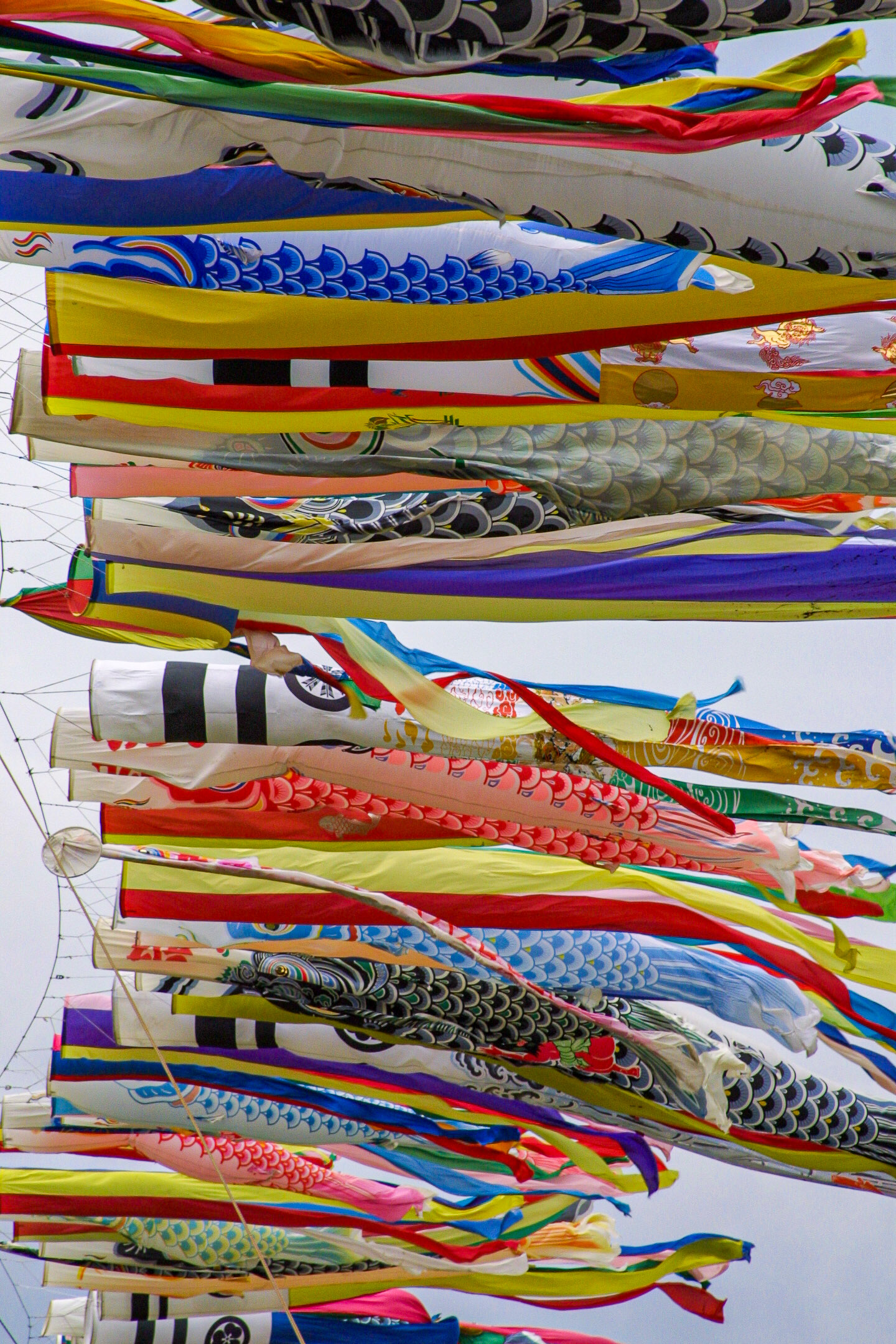 ねぎぼうずはご愛嬌。相模川の河原にたくさんのこいのぼりが泳いでいました。曇っているため、今ひとつ、活きが悪いですね。
