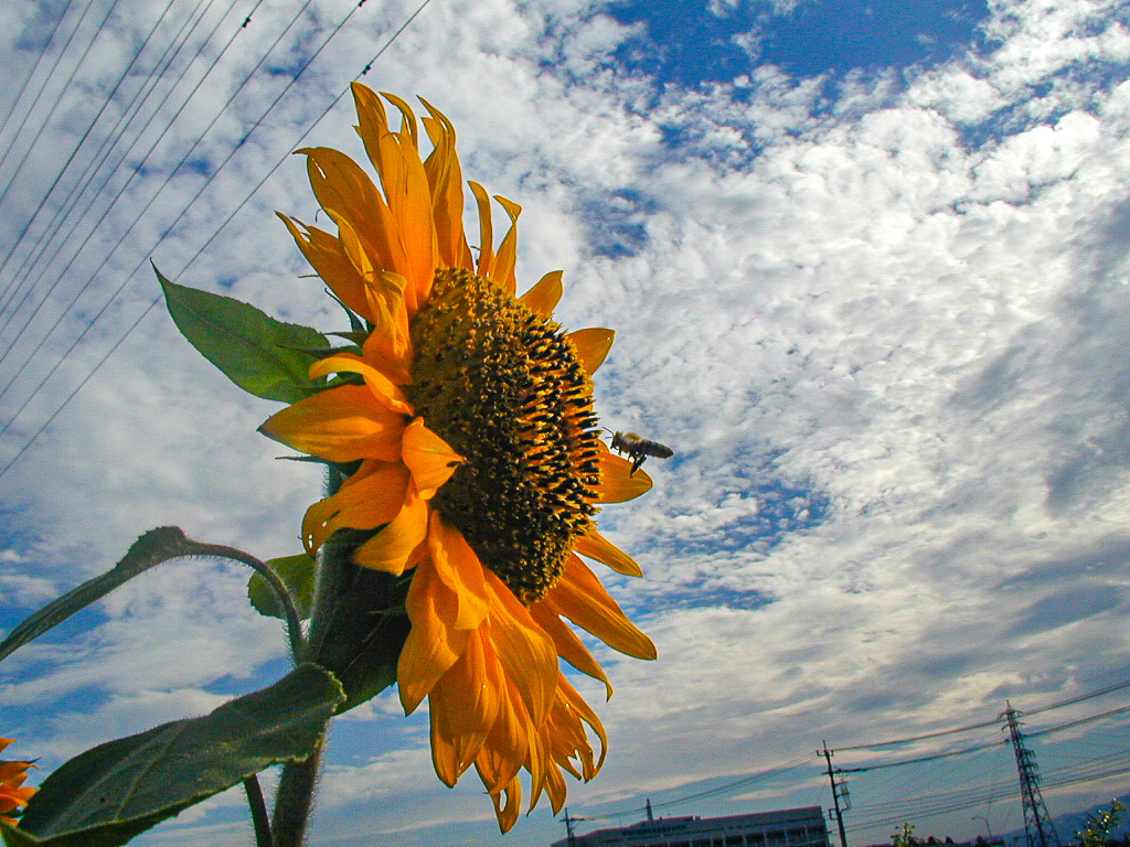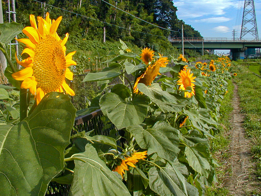 国道246号線上りで海老名市上今泉の近くを車で通りかかると、なんと、ひまわりが帯をなして咲いているのが遠くから見えました。慌てて横道にそれて、咲いている場所に近づき写真に収めました。