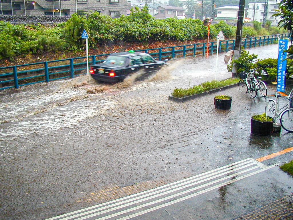 こちら神奈川県大和市では、午後4時半ごろ雷とともに激しい豪雨に見舞われました。小田急線が一時ストップしたそうで、ここはその線路脇の道路が冠水した様子をたまたま持っていたデジカメで撮影したものです。