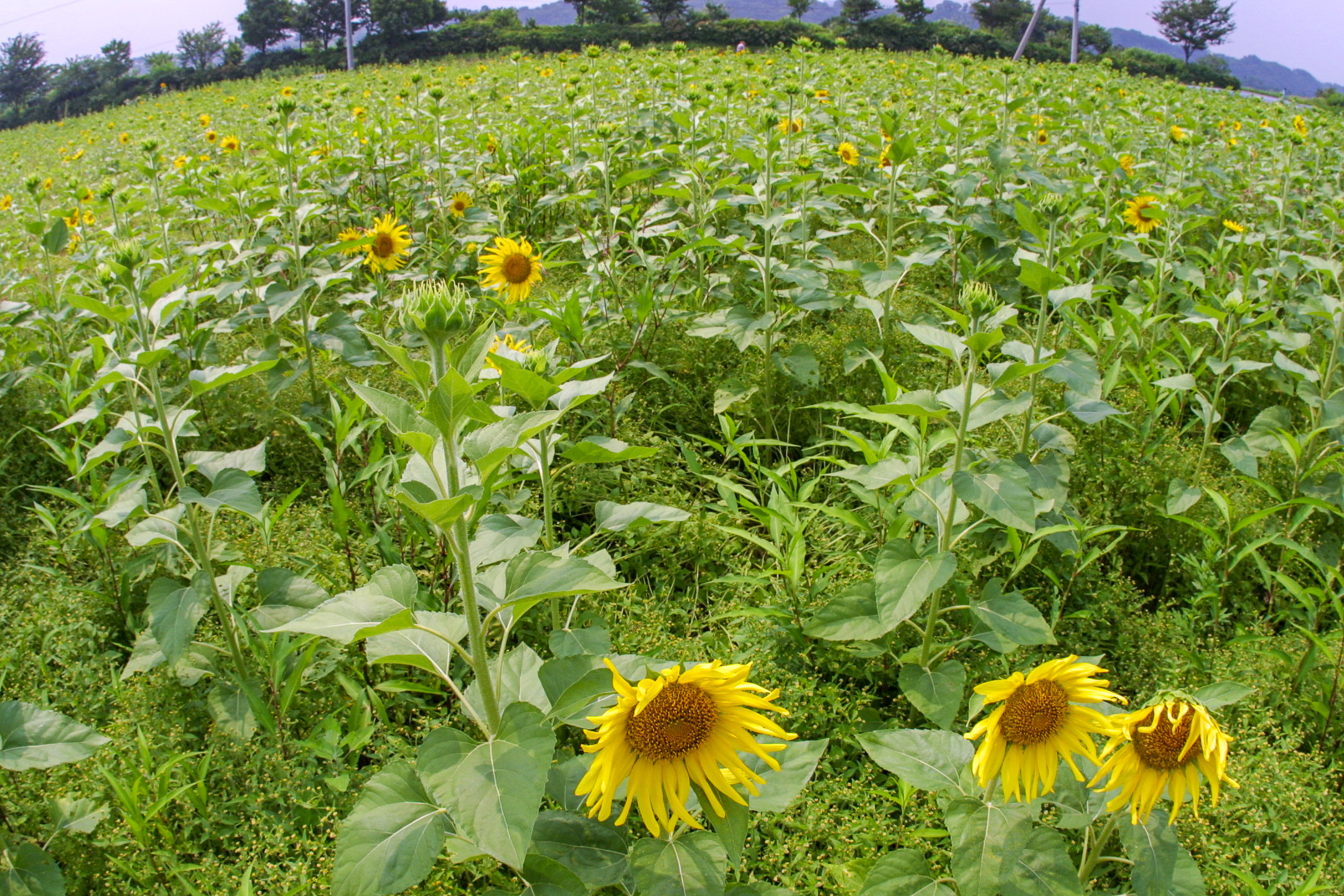青空のないはっきりしない天気ですが、そろそろどうかな?と思って座間市のひまわりを見て回ってきました。どうにか咲き出したのが、座架依橋近くのひまわりたちです。昨日の激しい雨のせいか、今ひとつ元気がありませんが、黄色い姿を見せていてくれました。