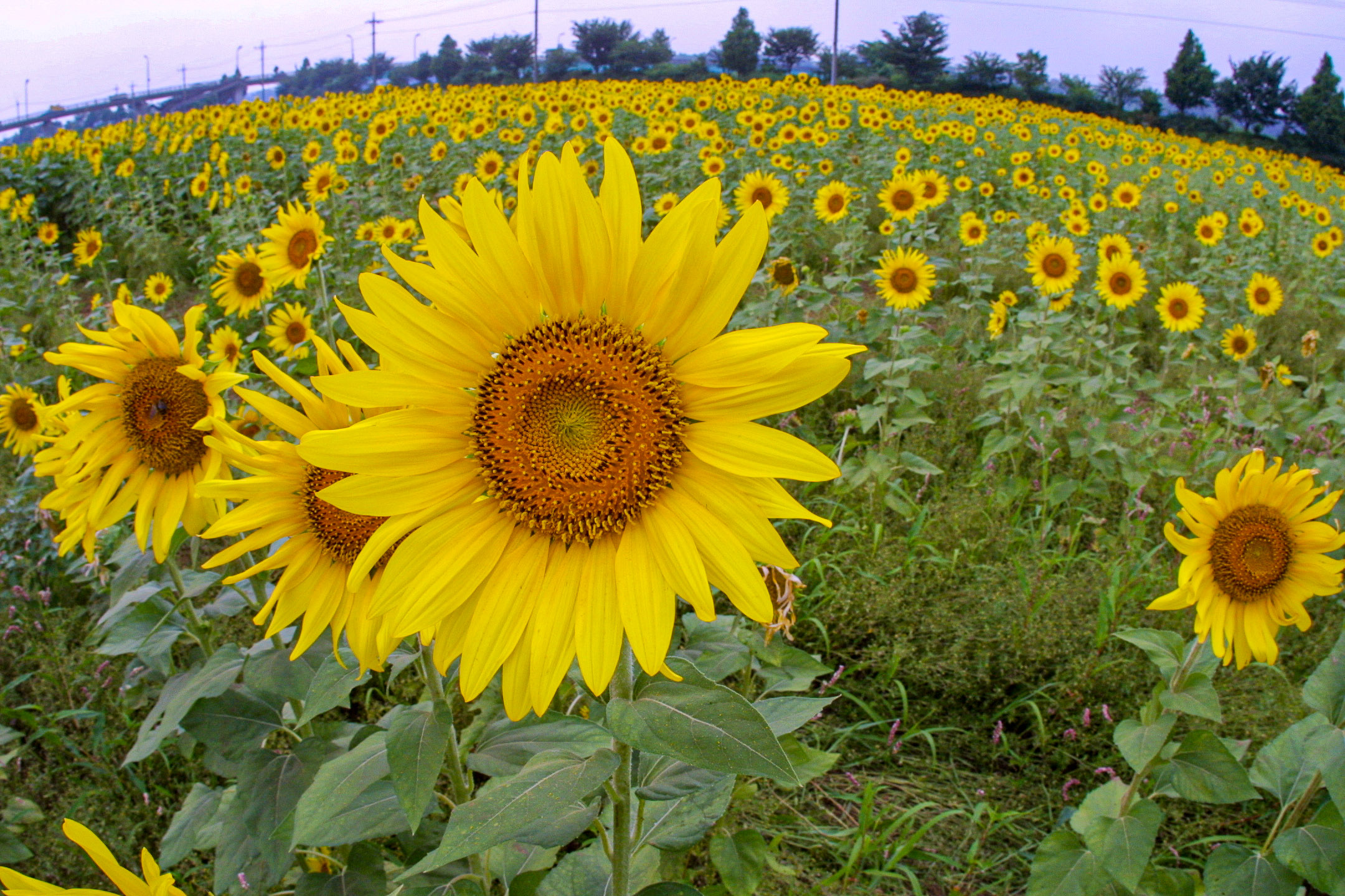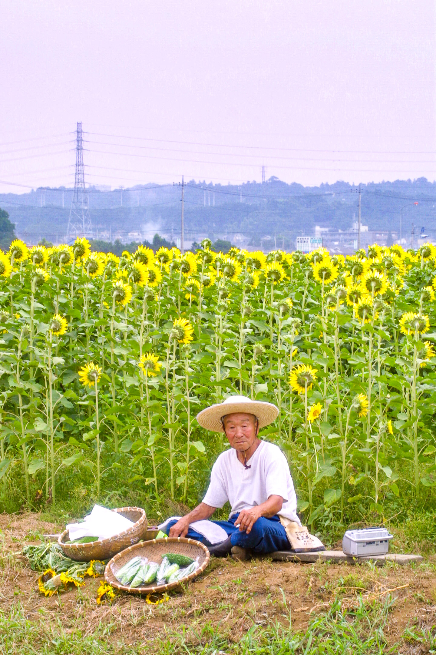 今日は休みでしたので、朝、座間のひまわりを見回りに行ってきました。座架依橋北のひまわり畑は今が見ごろで若々しい花を見事に開いていました。別のひまわり畑では、近くの農家のおじいさんがニガウリを売りに来ていました。