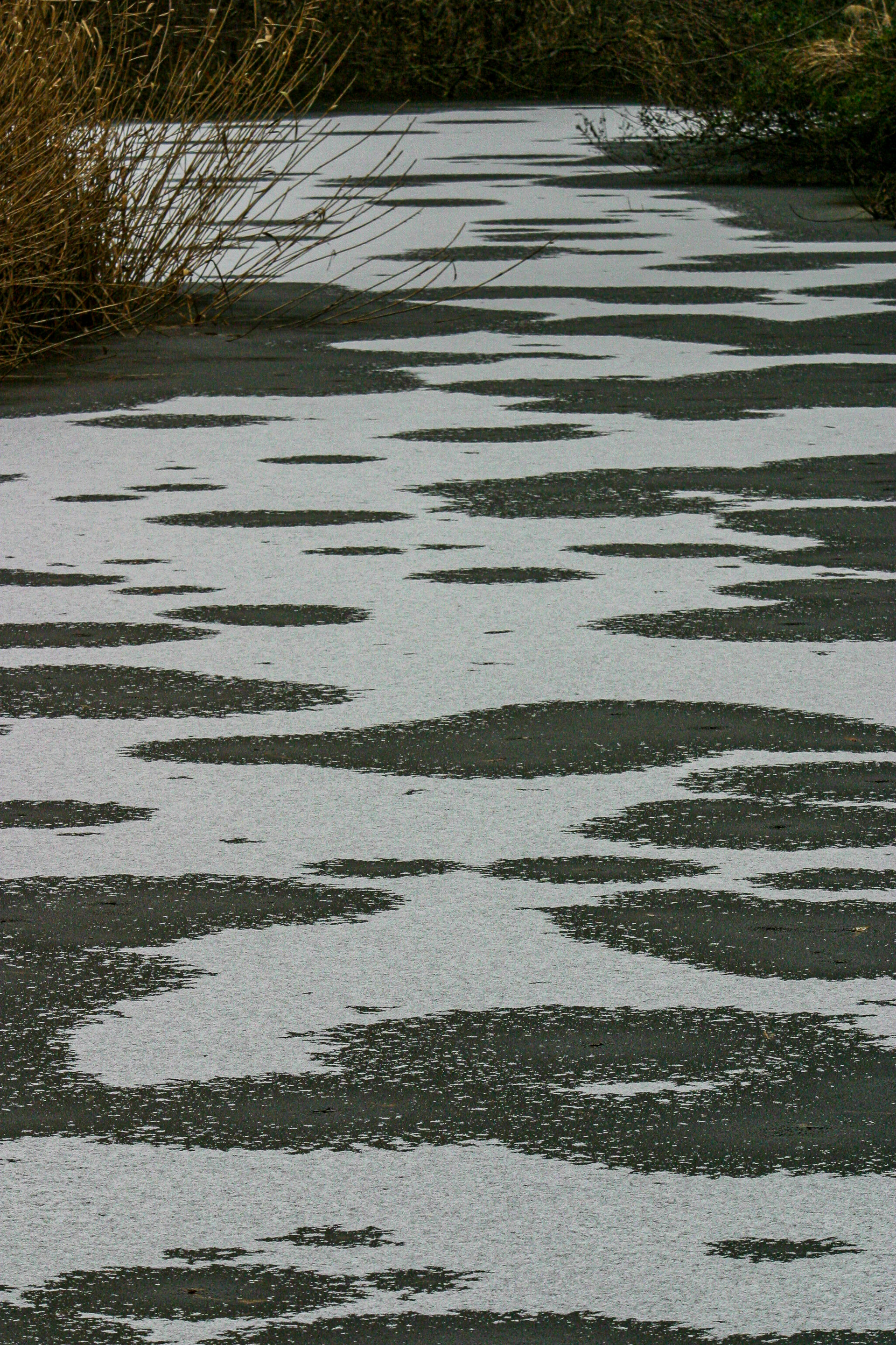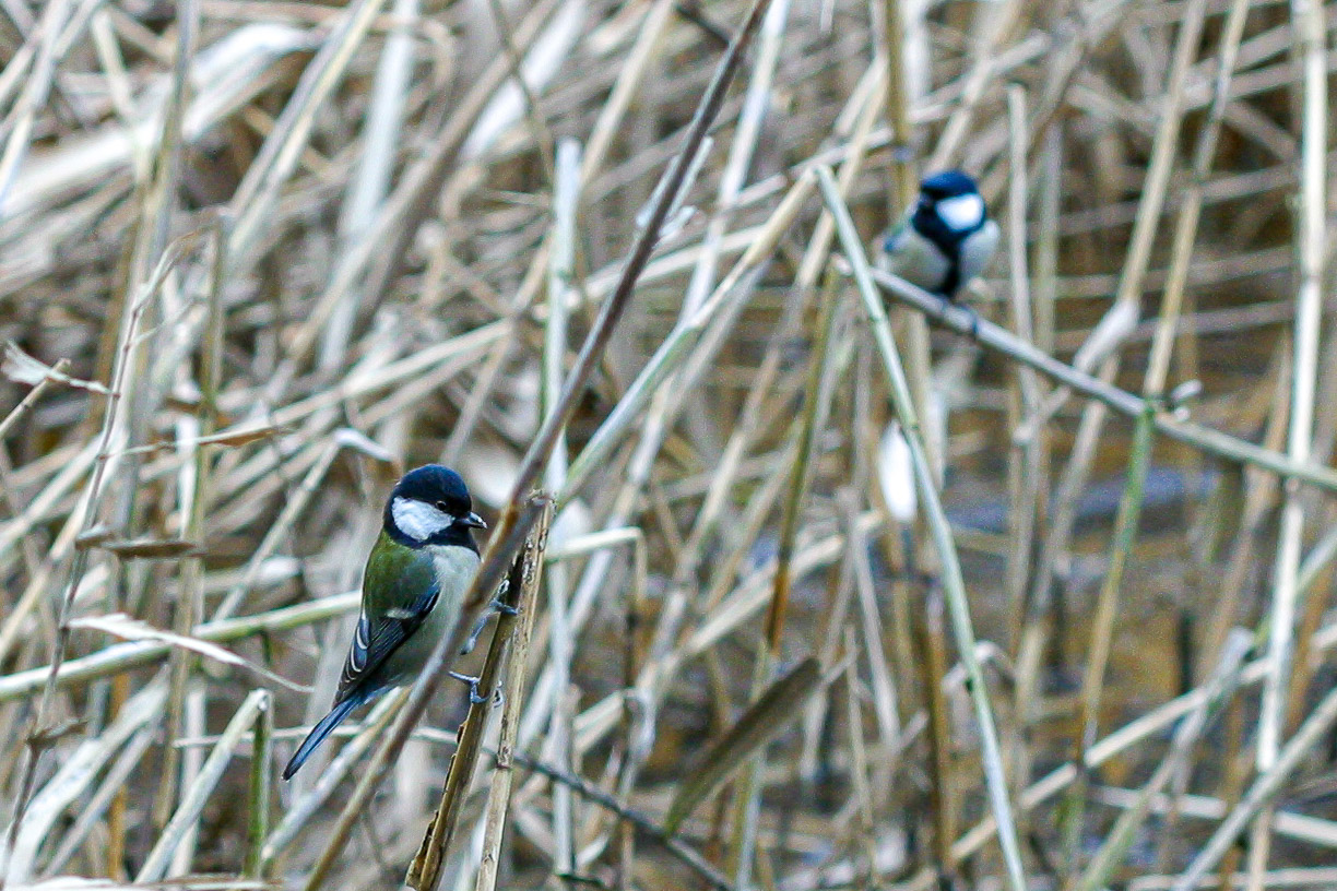 朝、冷え込み、細かい雪がサーっと舞う天気でした。いつもの座間市の谷戸山公園にあいさつ代わりに行ってみました。池は一部氷で覆われ、先ほどの雪が粉砂糖をまぶしたように淡く積もり、斑模様を描いていました。枯れたススキにはシジュウカラがとまったかと思ったら去っていきました。
