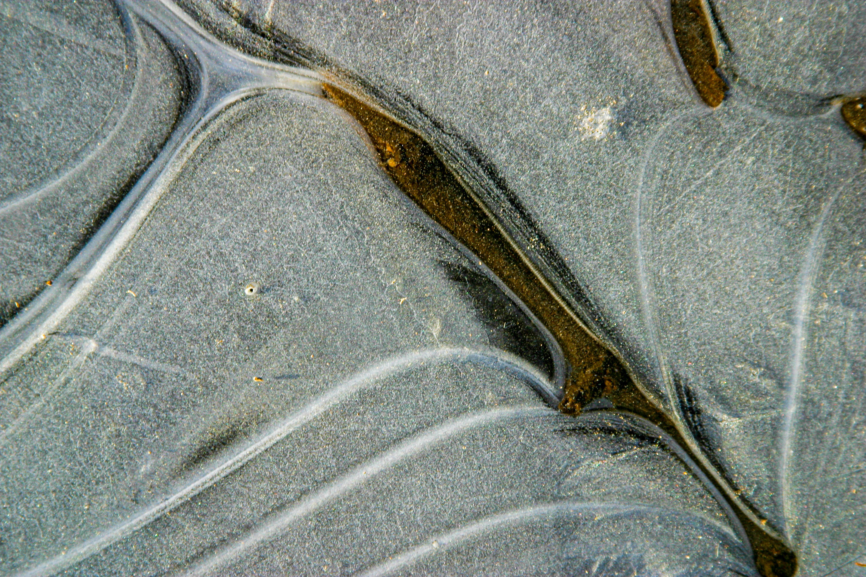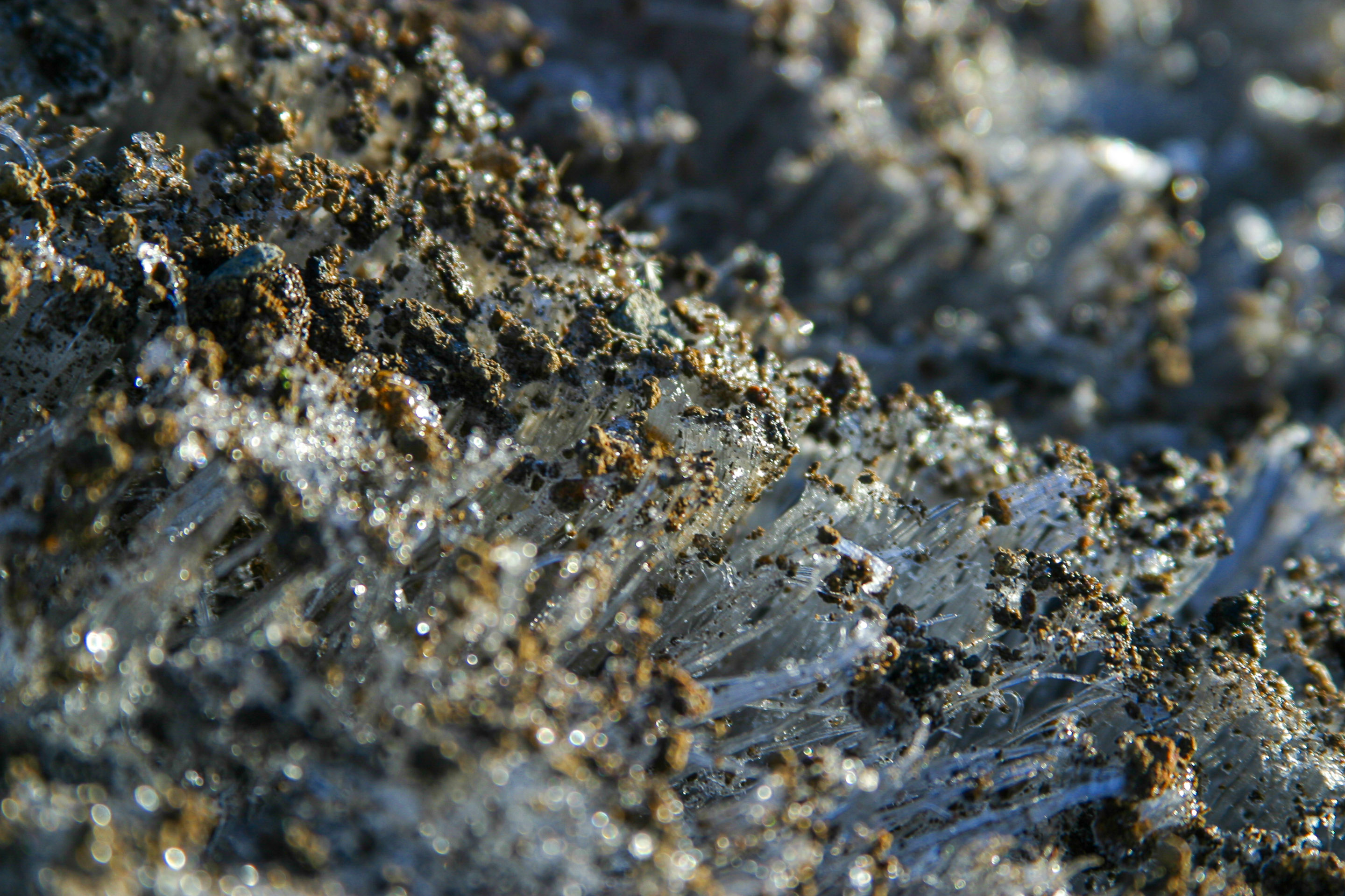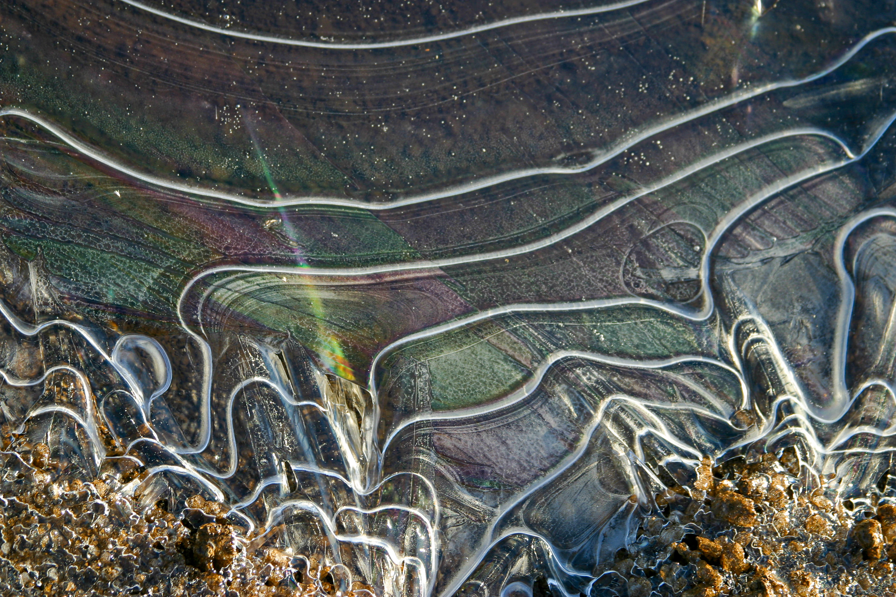 ということで身を引き締めるべく、朝、相模川方面に鳥でも撮ろうと行ってみたのですが、不発でした。ふと、足元に目をやると水溜りが氷りついて、不思議な模様を描いていたのでした。等高線か海図の入った地図のようですね。近くには霜柱もきらめいていました。