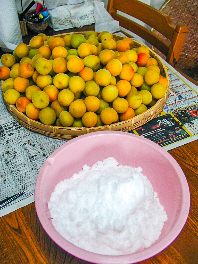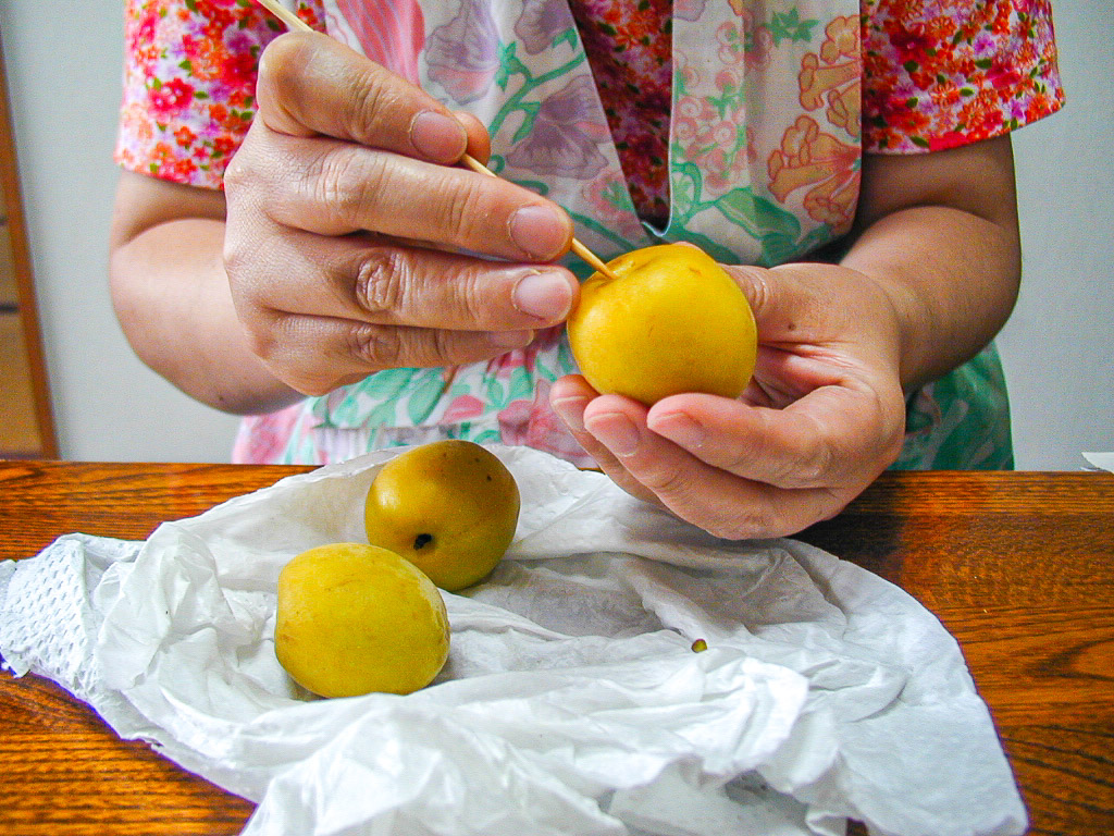 箱の上の方は、色づいていてちょうどいいのですが、下の方がまだ青いので一日ザルに出して、黄色っぽくなるのを待ちました。熟した方が、梅干になったとき皮が柔らかくなり品質がよくなります。青く固い梅は避けましょう。ですから、6月下旬が梅も安くなりちょうどいいのです。