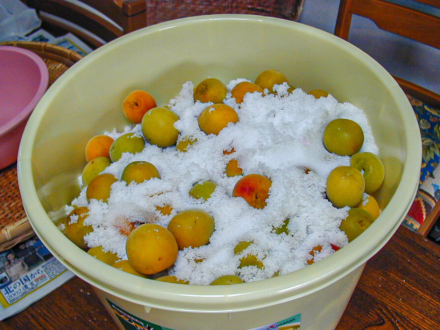 ③粗塩(「伯方の粗塩」を買いました)を梅の重さの20%程度を用意します。これだと、後で入れる赤じその塩分もあり、強すぎるので、18%(梅10キロなので1.8キロ)をハカリできちっと量ります。