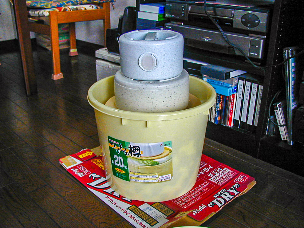 あとは、水が上がってくる2、3日後に次の赤じそを入れますが、また、そのときに解説しましょう。(^-^)赤じそを使用しなければ、梅雨明けの7月20日ごろまで冷暗所にこのまま放置しておけばよろし。 |
