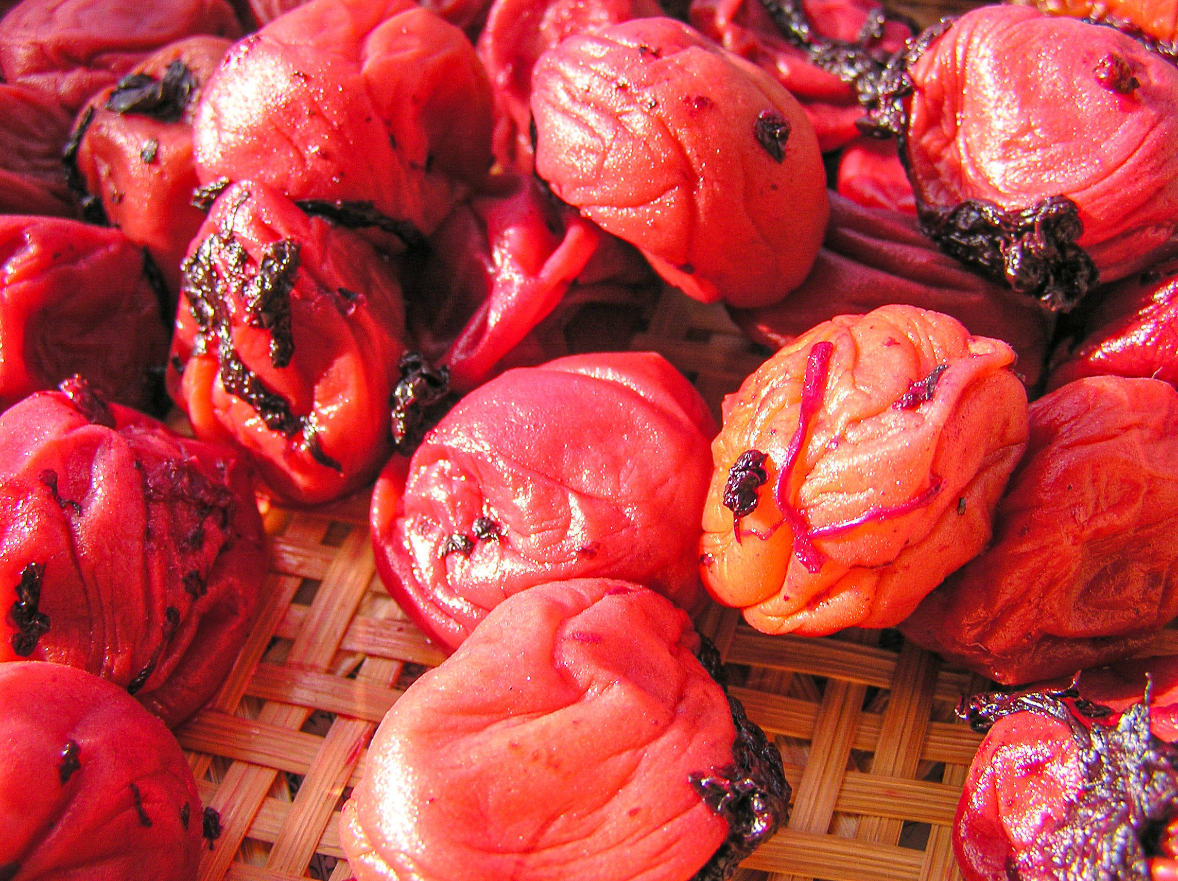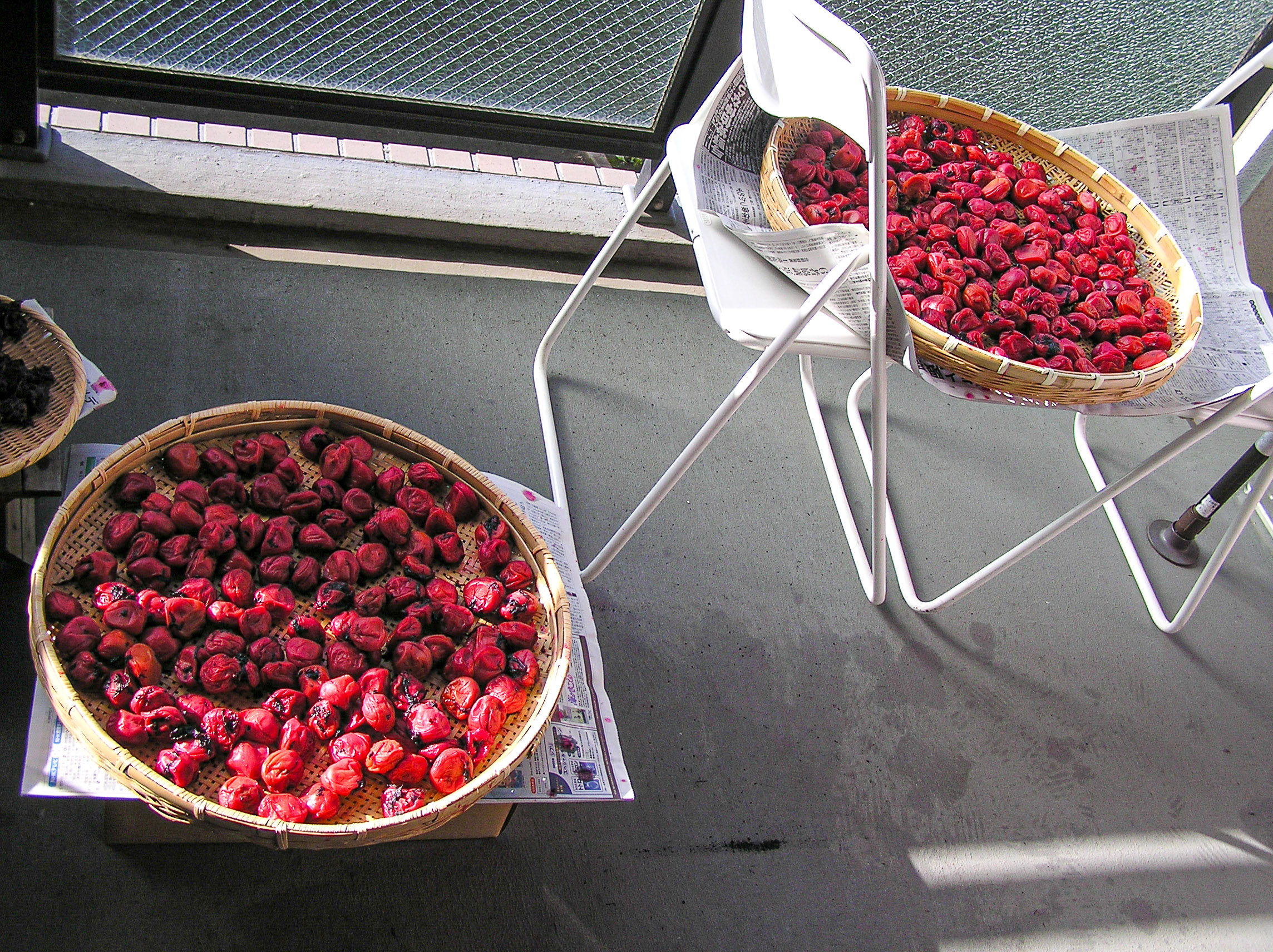 しかし、もう待っていられませんので、梅干し決行!今日も仕事でしたので、早起きして朝6時過ぎにベランダに干しました。青梅で10キロあった梅もこればかりの量になりました。いつもの年より20日ほど長く漬けたため、赤ジソによる染まり具合が強く色鮮やかになりました。(C-750UZ)