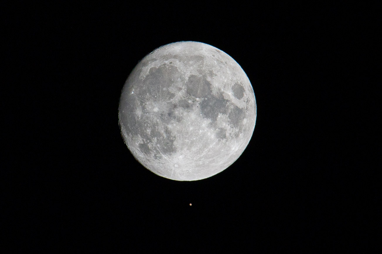 火星がまた脚光を浴びる日となりました。見かけ上、月と火星が大接近です。午後8時30分ごろ、火星は月の真下に来ました。小さな点にしか過ぎませんが、見えますか?ベランダから気軽に撮りました。望遠鏡はないので、ここまでの撮影です。(^-^)(EOS D60)