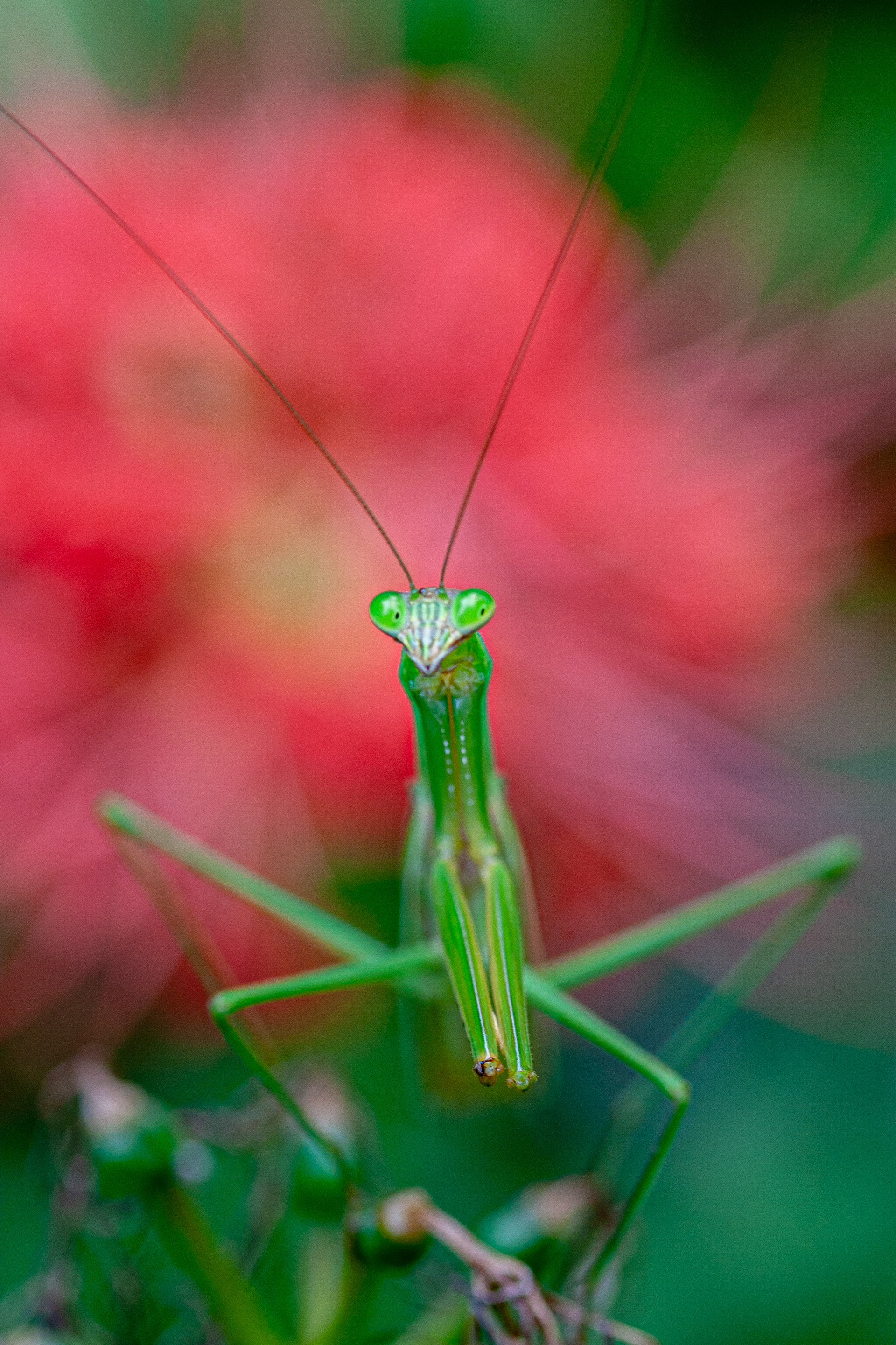 帰りながら、また、彼岸花を撮っているとカマキリくんに出会いましたよ。彼岸花をバックに記念写真(^-^)でも、この後近づきすぎて、飛びかかられました。(*_*)(EOS