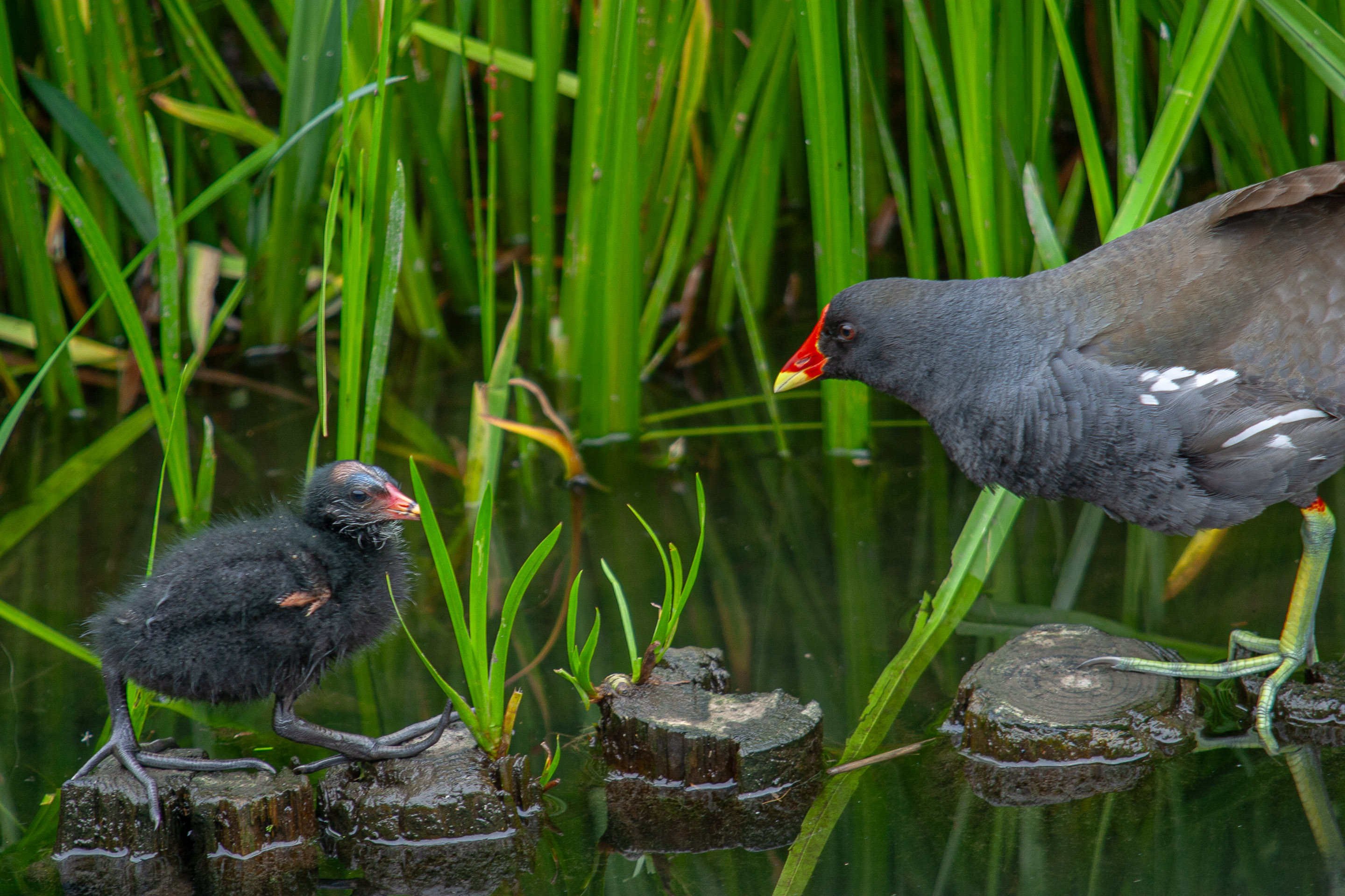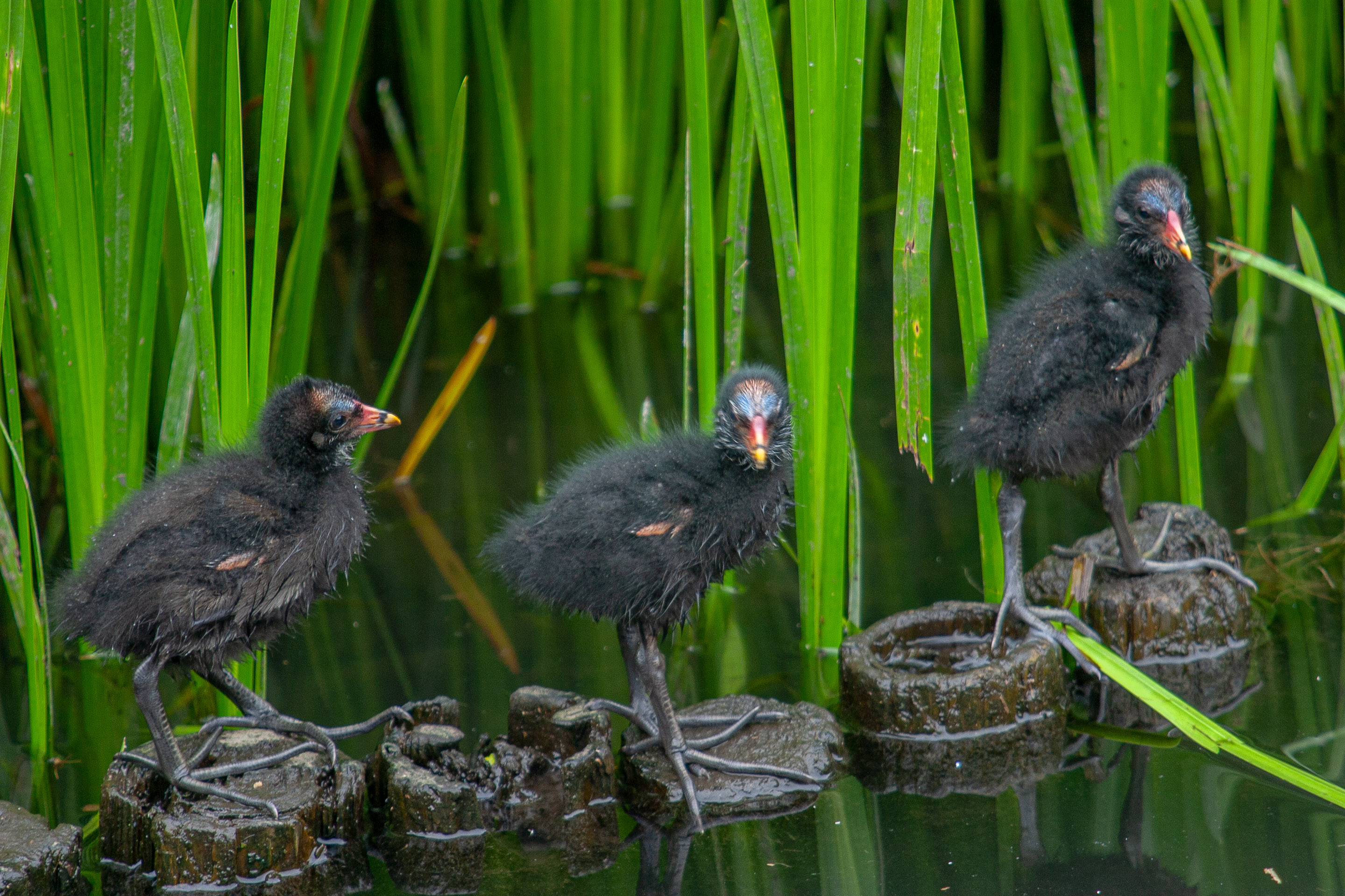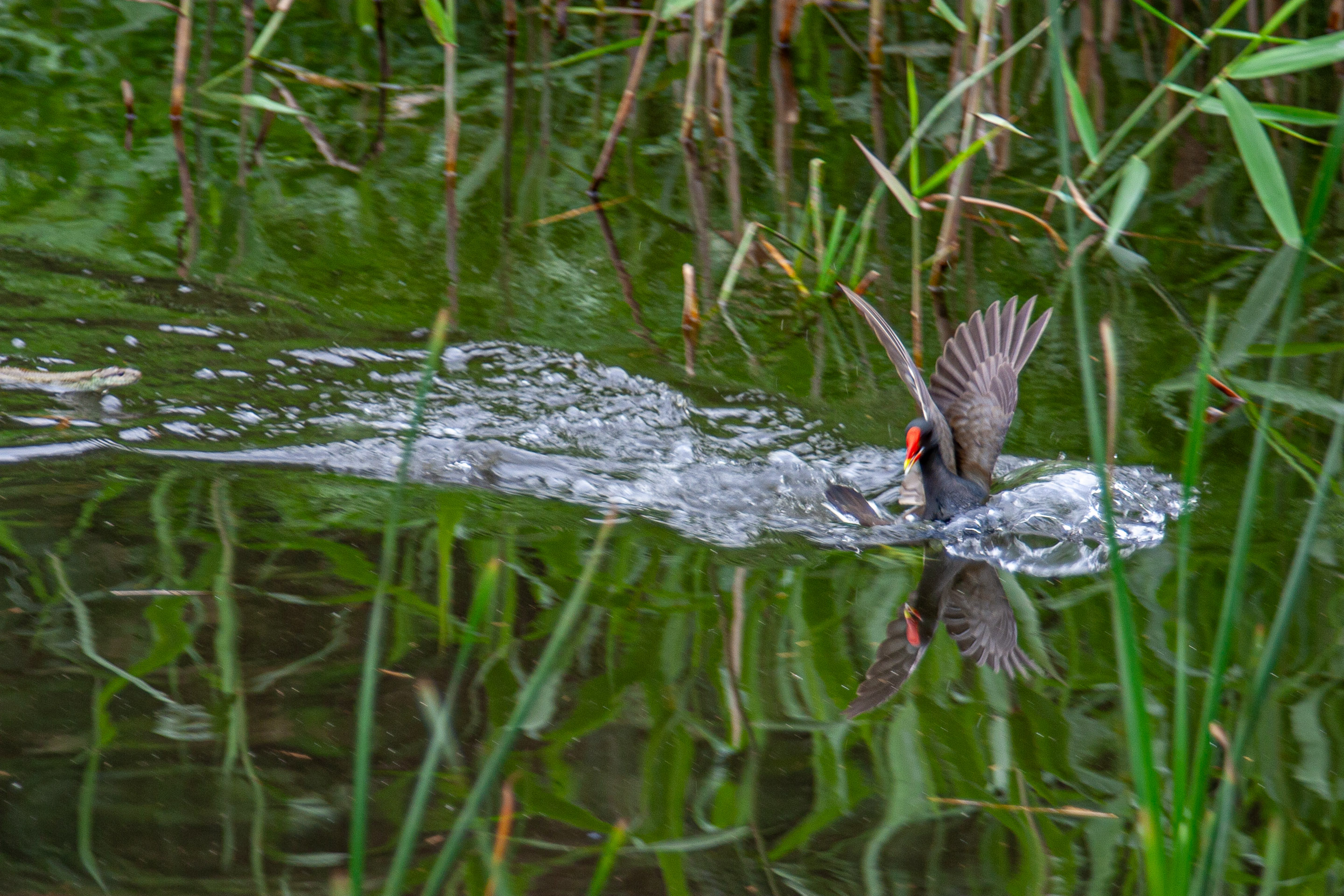 今日もまた泉の森に行ってきました。薄曇りで蒸し暑いのは昨日と同じ。カワセミを撮る人々は今日もたくさんいますが、池の人気者はバンの親子。クイナの仲間のこの鳥は、足に水かきがありませんが器用に泳ぎます。4羽のヒナをヘビから守るため必死に身を挺して親鳥が戦うシーンもありました。
