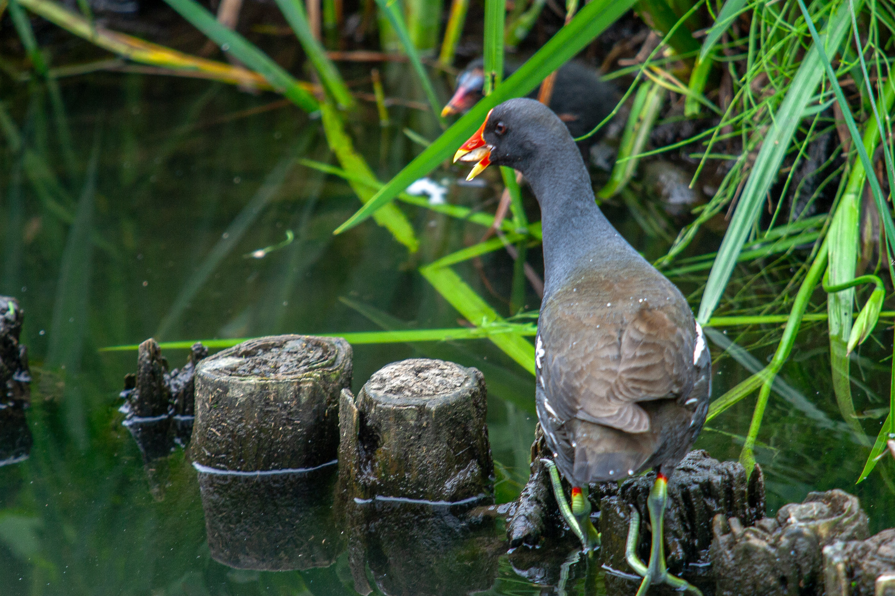 根元が赤く先が黄色の嘴が印象的なバン
