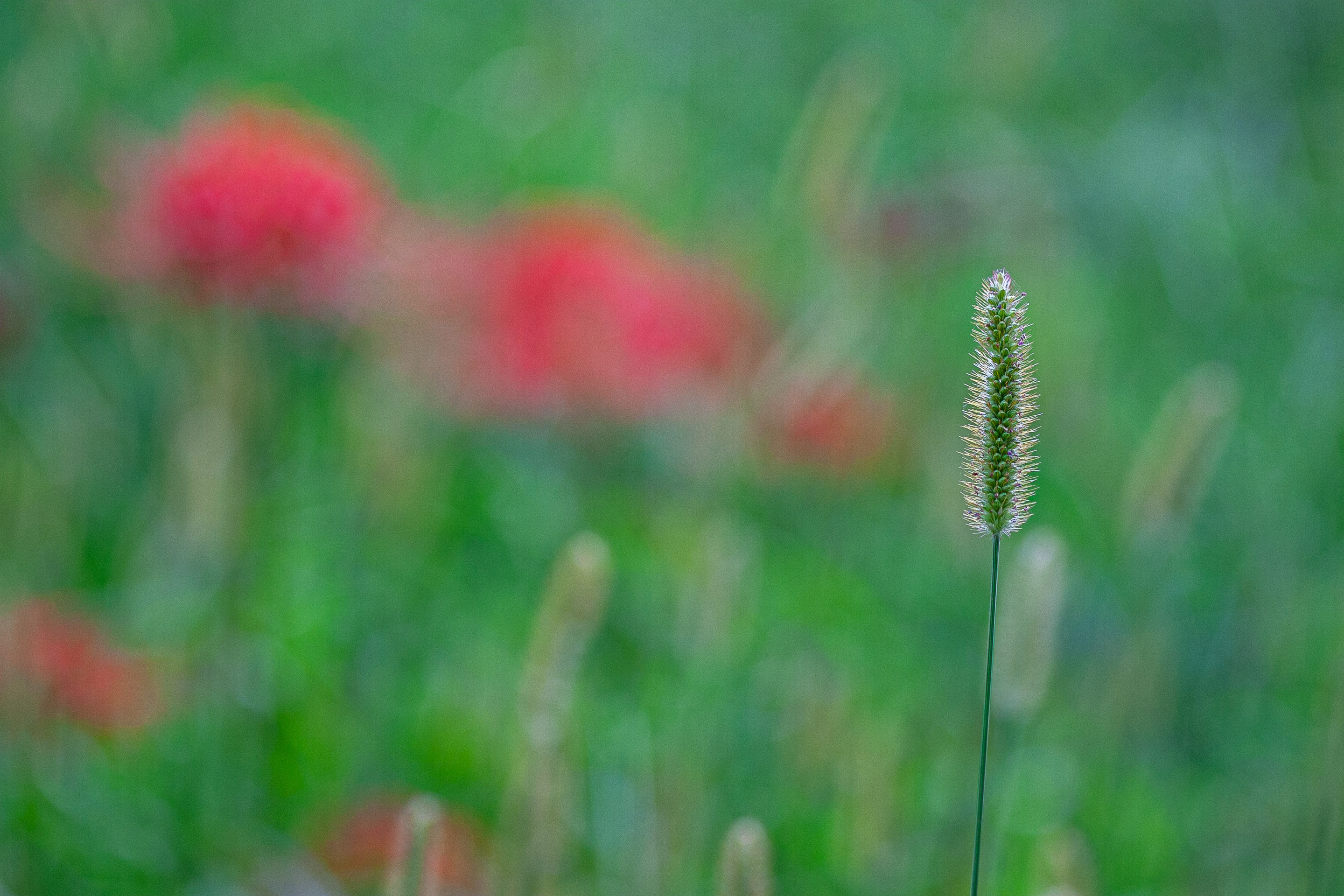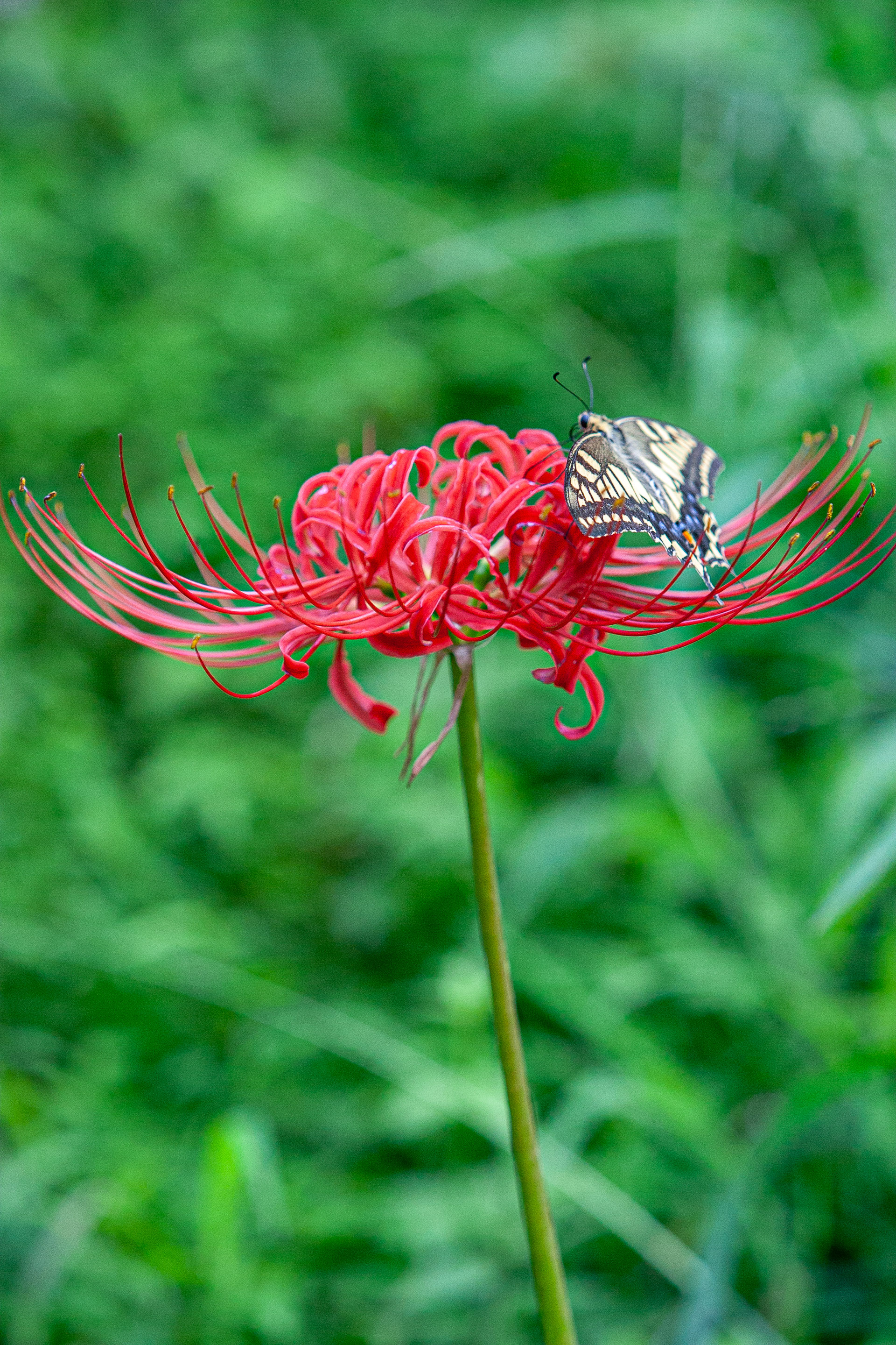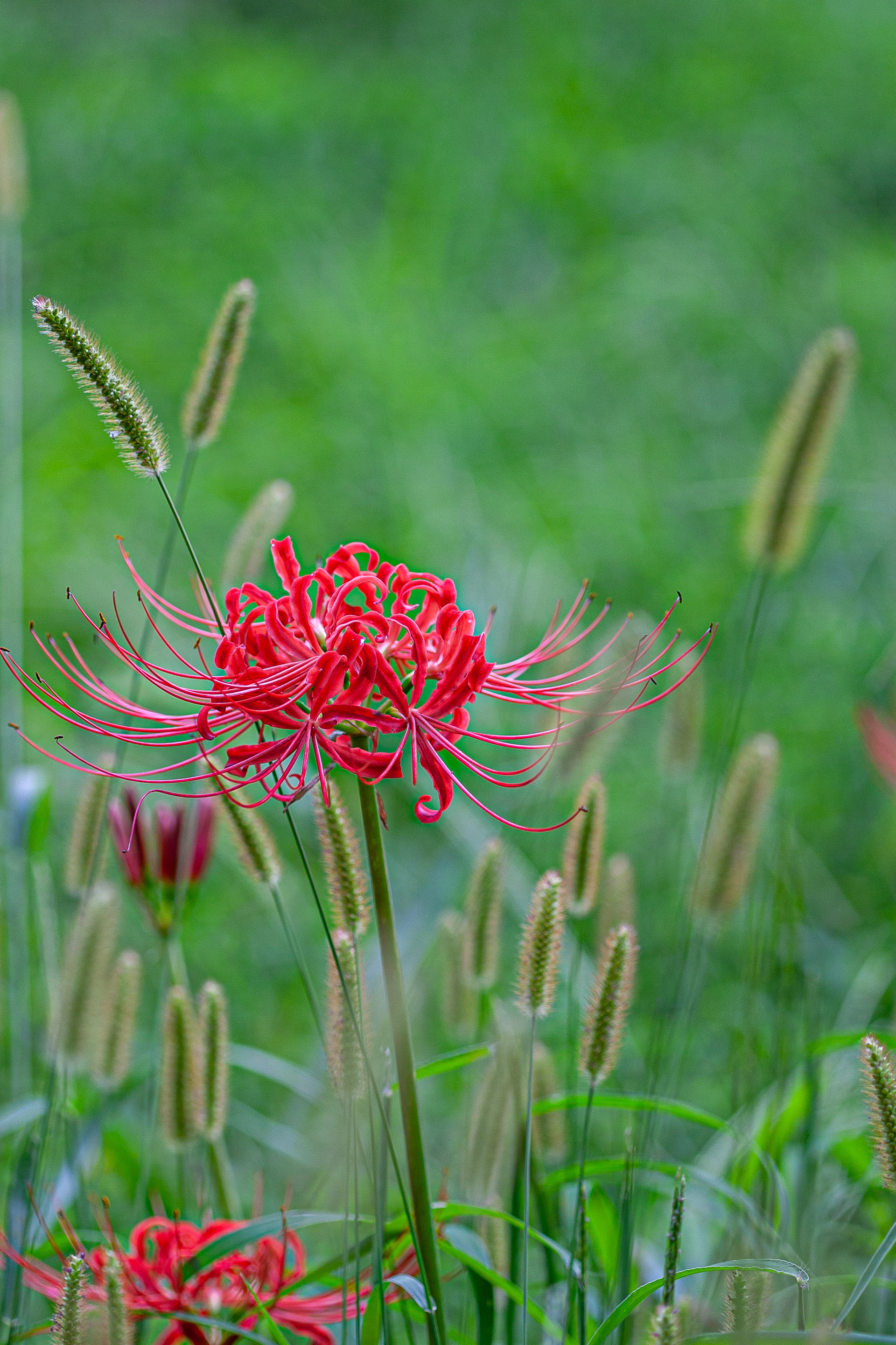 彼岸花が次々に咲いている谷戸山公園です。色々な雑草とともにポツリポツリと咲いている彼岸花もなかなかいいですよ。(EOS